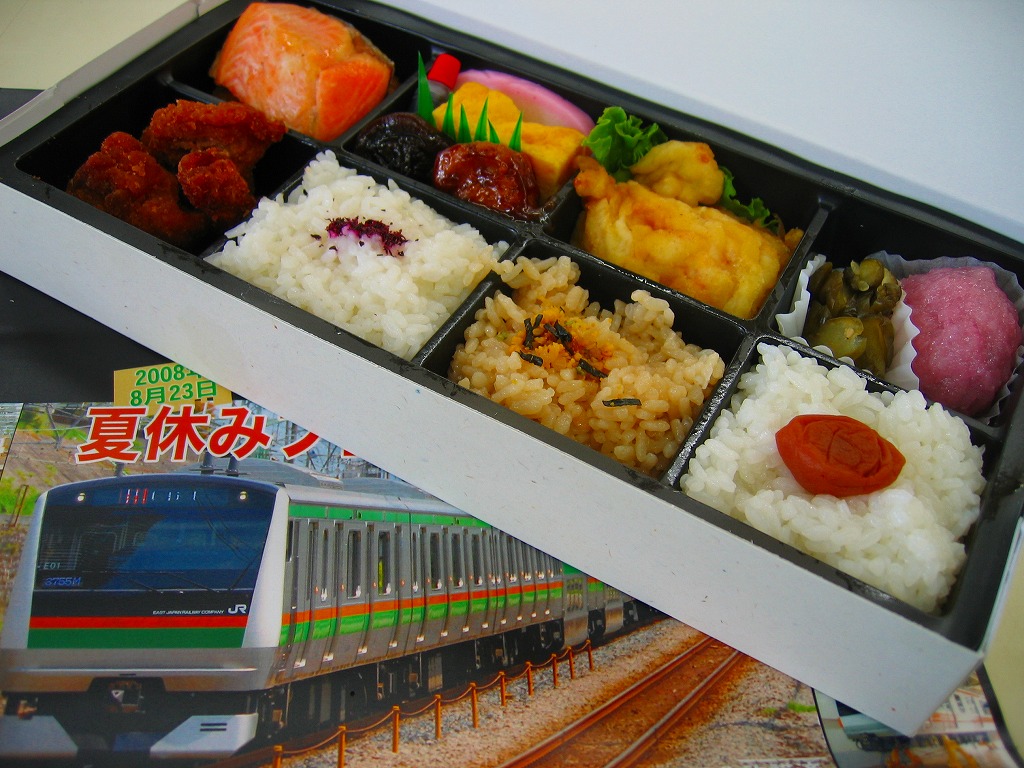 2012(平成24)年8月25日の鉄道工場公開イベントで販売されたお弁当。この年は4種類がすべて同じ値段で用意された。掛紙はE233系電車のうち東海道線などで使われる3000番台。中身は普段「はつらつ」の名称でNREが受注生産している宅配弁当。日の丸御飯にサーモン味噌焼、豚肉生姜焼、マイタケ天、玉子焼、レンコンやタケノコなどの煮物、人造肉(大豆たんぱく)甘辛煮。豚肉と人造肉がえらく臭かったような。