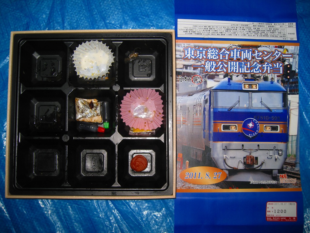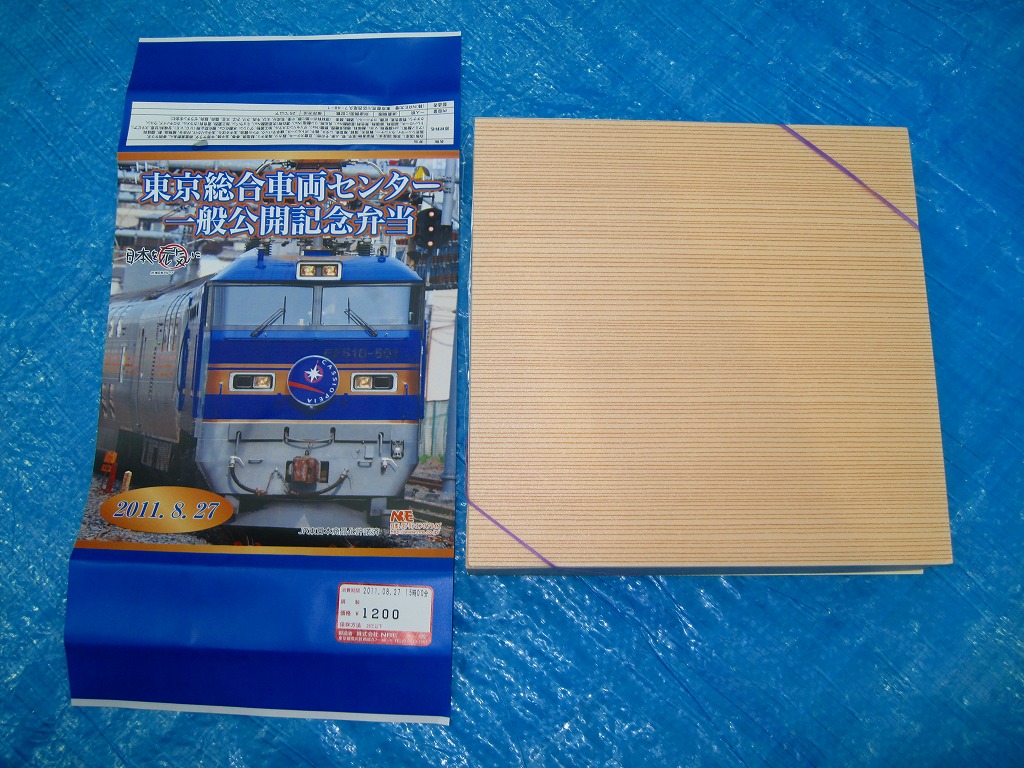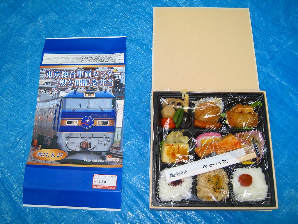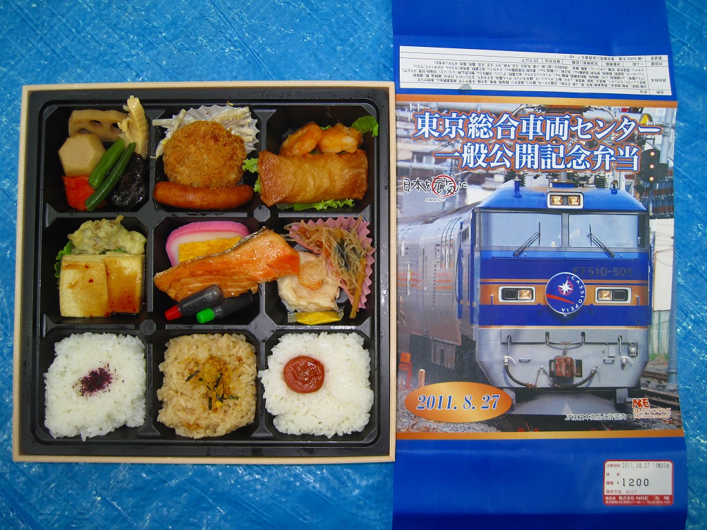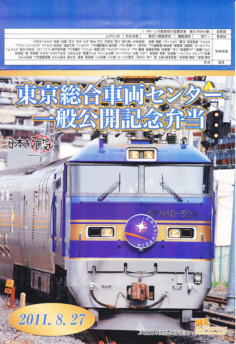 2011(平成23)年8月27日の鉄道工場公開イベントで販売されたお弁当。今年は3種類が用意された。掛紙はJR東日本のEF510形500番台電気機関車のトップナンバーが寝台特急列車「カシオペア」を牽引している写真。