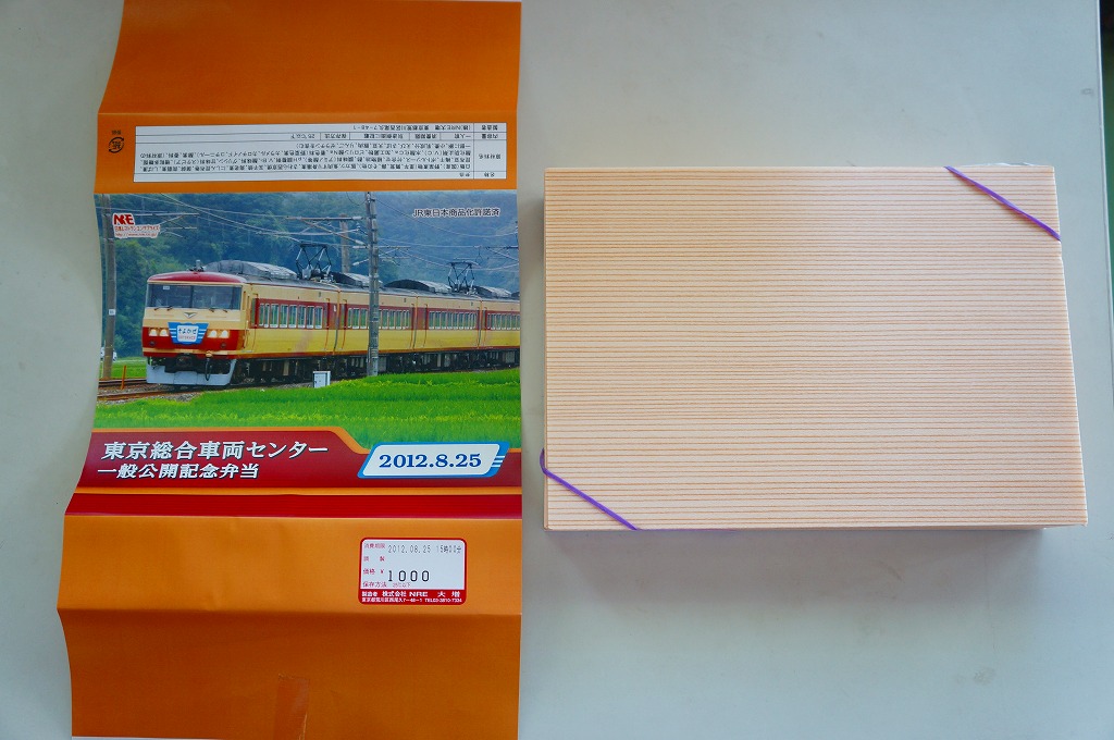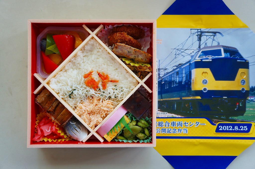 2012(平成24)年8月25日の鉄道工場公開イベントで販売されたお弁当。この年は4種類がすべて同じ値段で用意された。掛紙は国鉄時代に製造されJR東日本が保有し東京総合車両センターで保管されている193系事業用電車で、走りながら直流電化区間の信号や架線の状態をチェックする電気検測車。