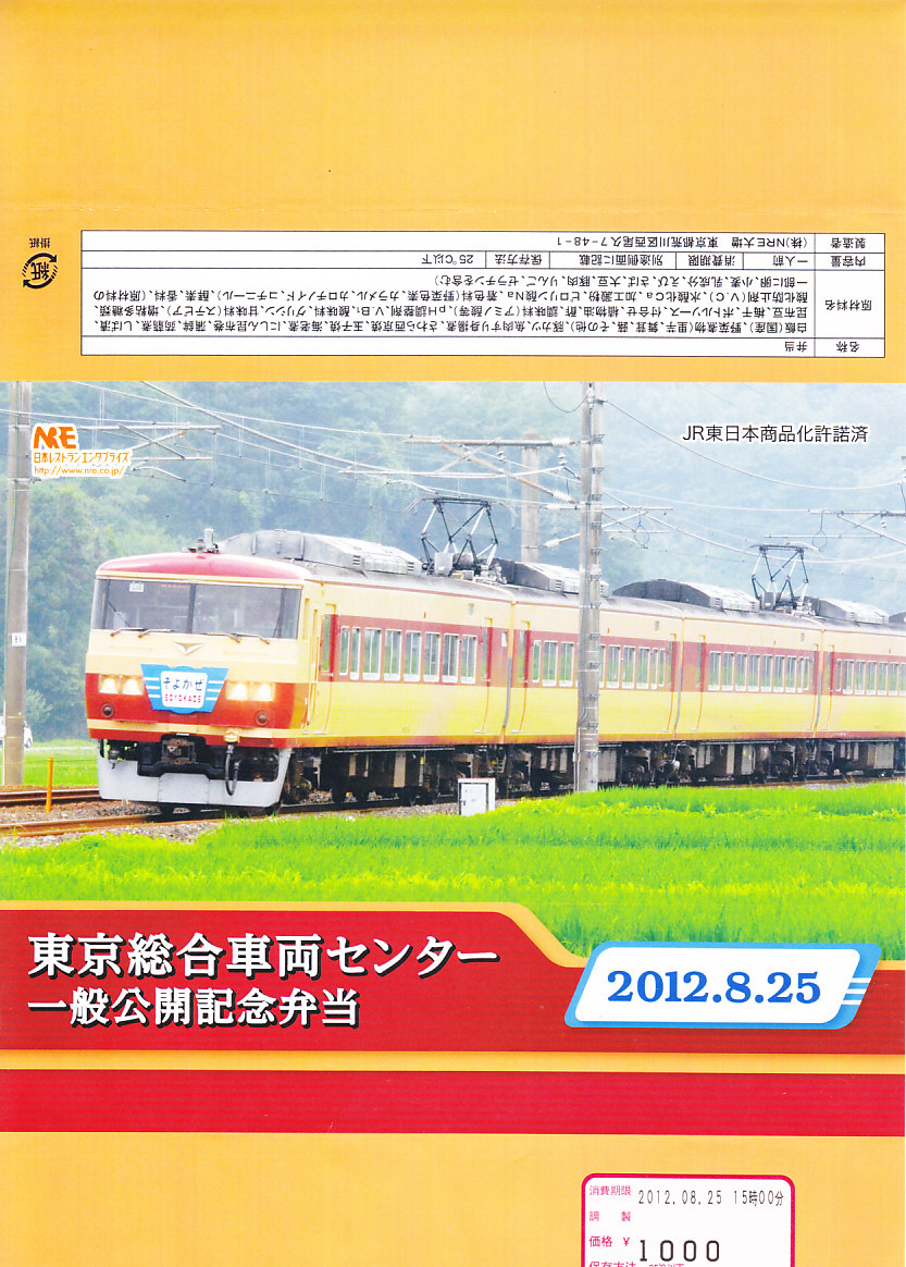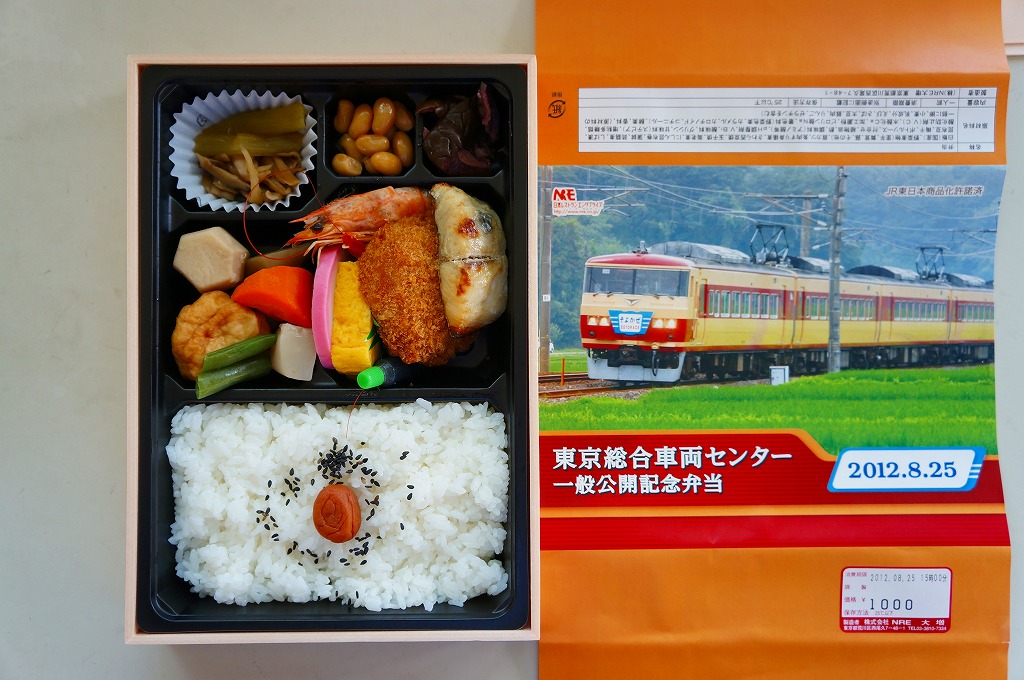 2012(平成24)年8月25日の鉄道工場公開イベントで販売されたお弁当。この年は4種類がすべて同じ値段で用意された。掛紙は185系国鉄色(日光形)で2012年7月15日に上野駅と横川駅との間で運転された臨時特急そよかぜの走行写真。中身は普段「ありあけ」の名称でNREが受注生産している宅配弁当。日の丸御飯にトンカツ、サワラ西京焼、エビ煮、かまぼこ、玉子焼、サトイモやコンニャクなどの煮物、ニシン昆布巻、昆布豆、柴漬けなど。