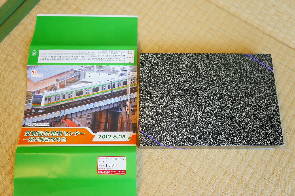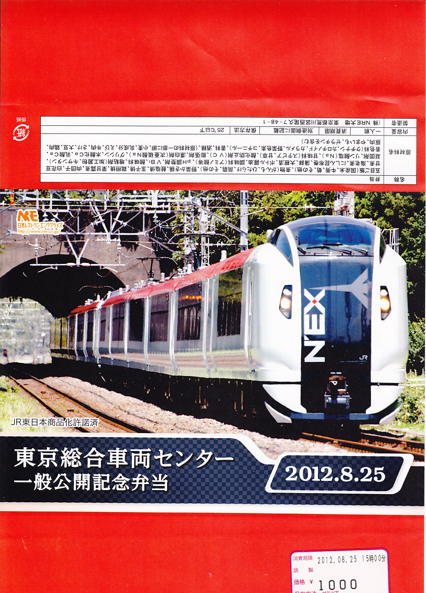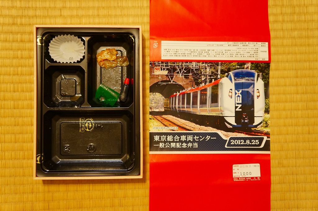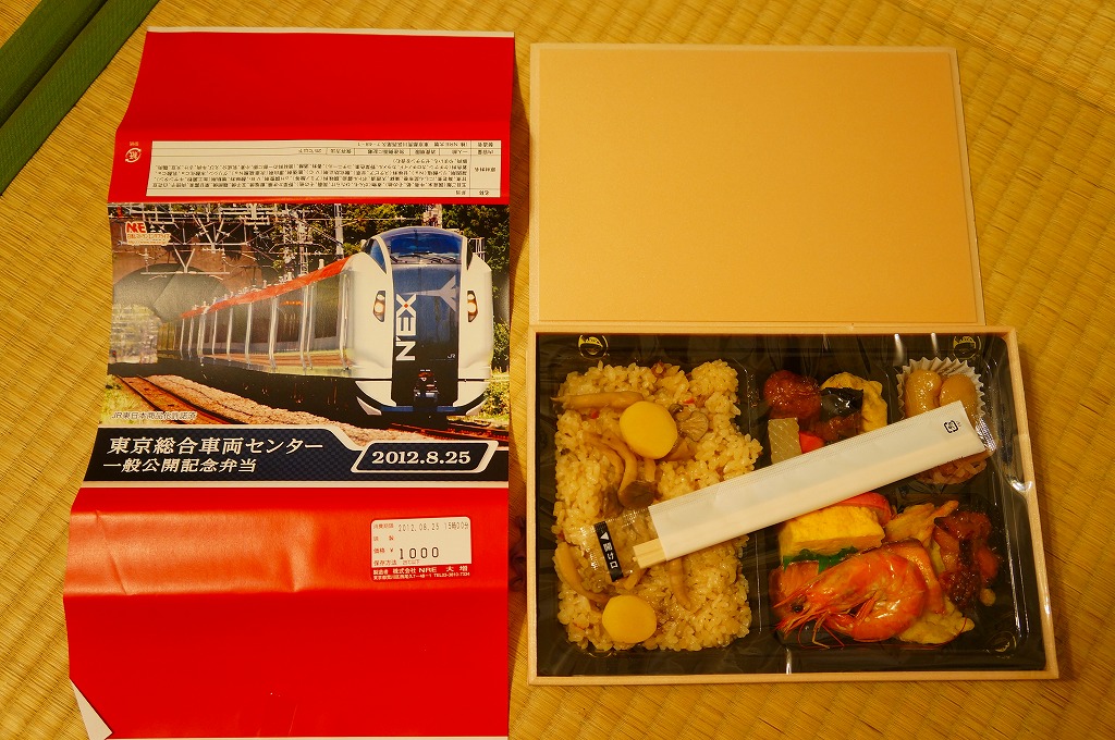 2012(平成24)年8月25日の鉄道工場公開イベントで販売されたお弁当。この年は4種類がすべて同じ値段で用意された。掛紙はJR東日本のE259系特急形電車。中身は普段「せせらぎ」の名称でNREが受注生産している宅配弁当。シメジやタケノコなどの五目飯に有頭海老、鮭塩焼、鶏照焼、野菜かき揚、かまぼこと玉子焼、肉団子と昆布やニンジンなどの煮物、煮豆と紅生姜。今回の4種の中では最もうまかった。