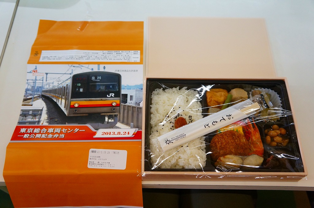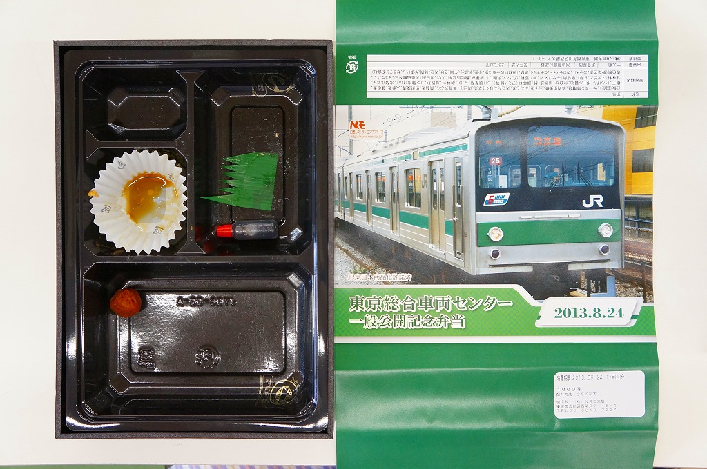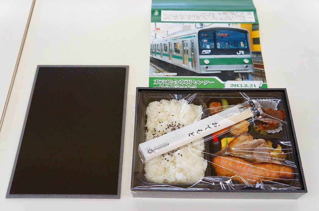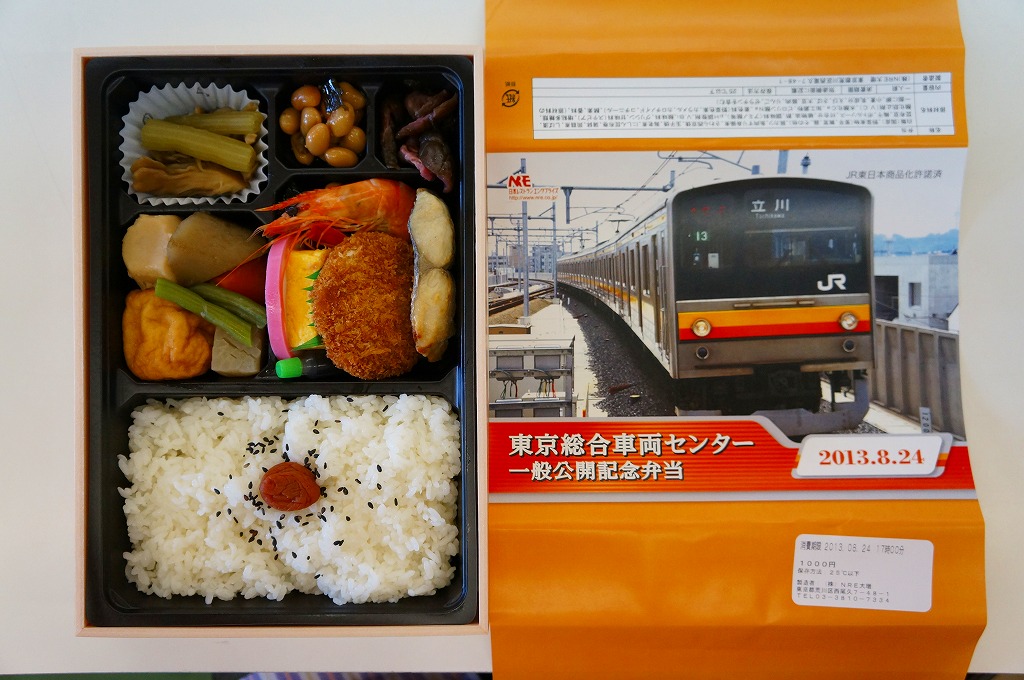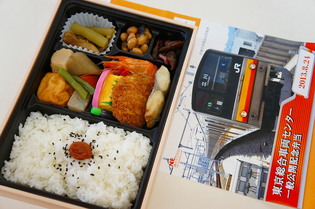 2013(平成25)年8月24日の鉄道工場公開イベントで販売されたお弁当。この年も前年に引き続き、4種類がすべて同じ値段で用意された。掛紙はJR東日本の南武線の205系通勤形電車。中身は普段「ありあけ」の名称でNREが受注生産している宅配弁当。日の丸御飯にサワラ西京焼、有頭海老、とんかつ、昆布豆、玉子焼、煮物など。