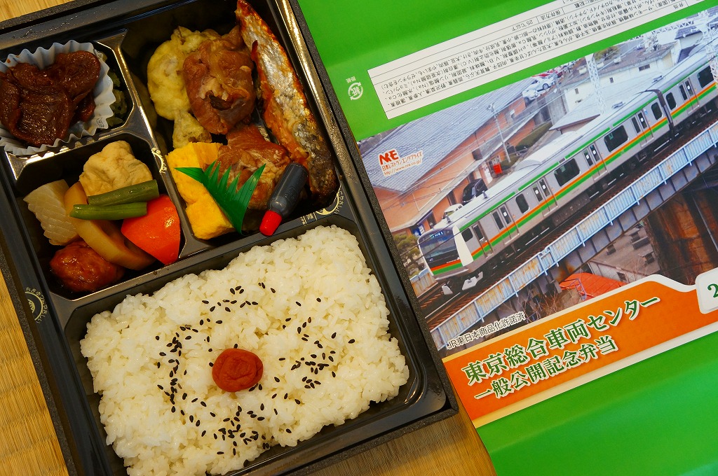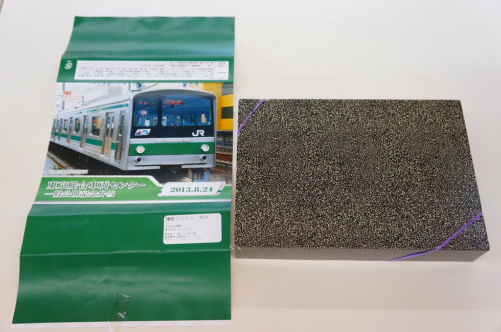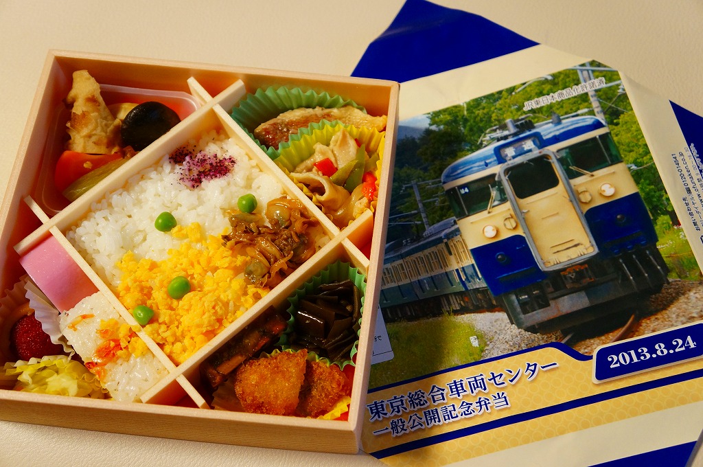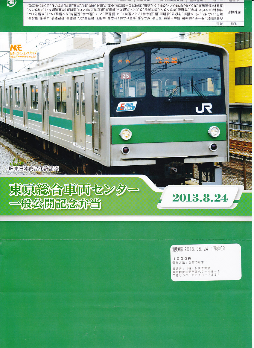 2013(平成25)年8月24日の鉄道工場公開イベントで販売されたお弁当。この年も前年に引き続き、4種類がすべて同じ値段で用意された。掛紙はJR東日本の南武線の205系通勤形電車。中身は普段「ありあけ」の名称でNREが受注生産している宅配弁当。日の丸御飯にサワラ西京焼、有頭海老、とんかつ、昆布豆、玉子焼、煮物など。