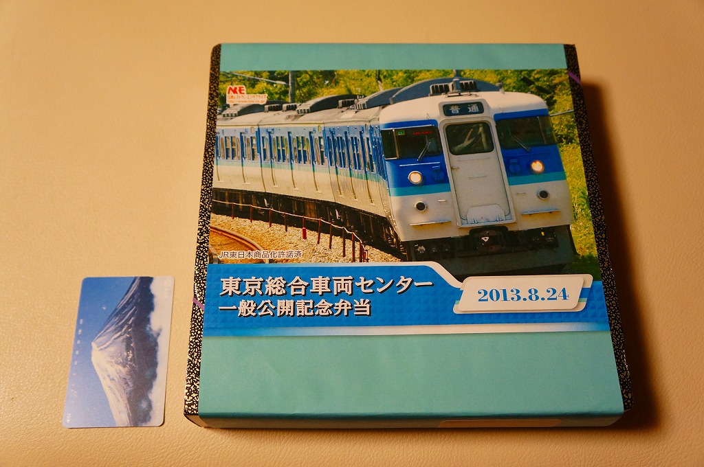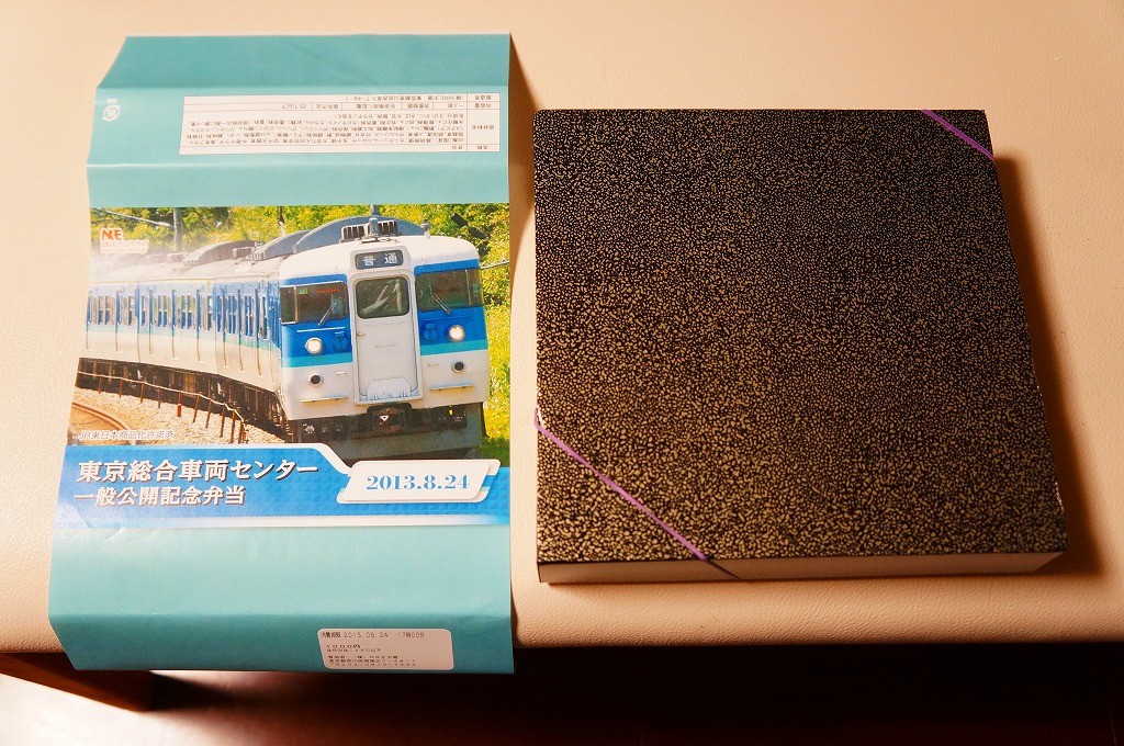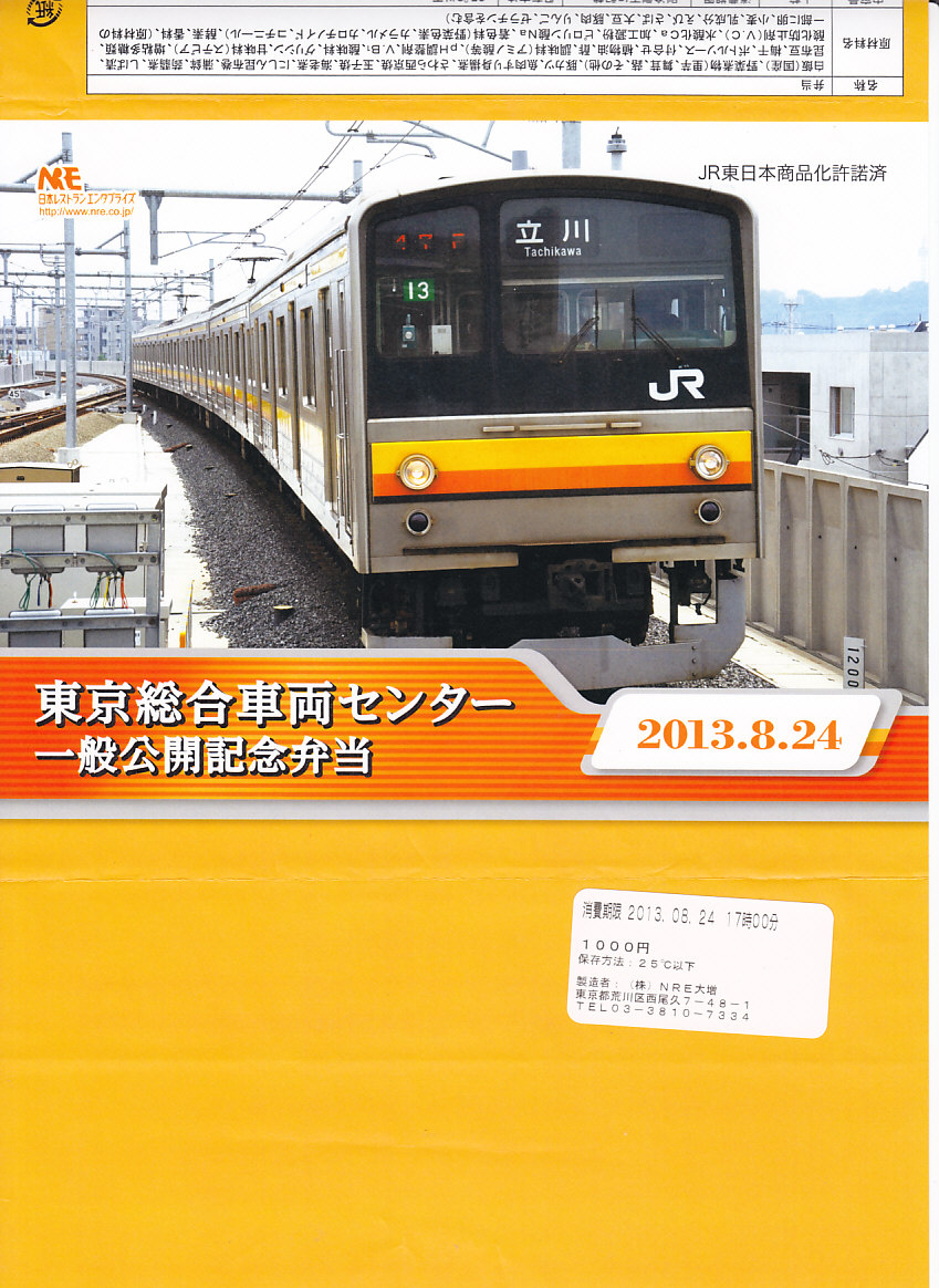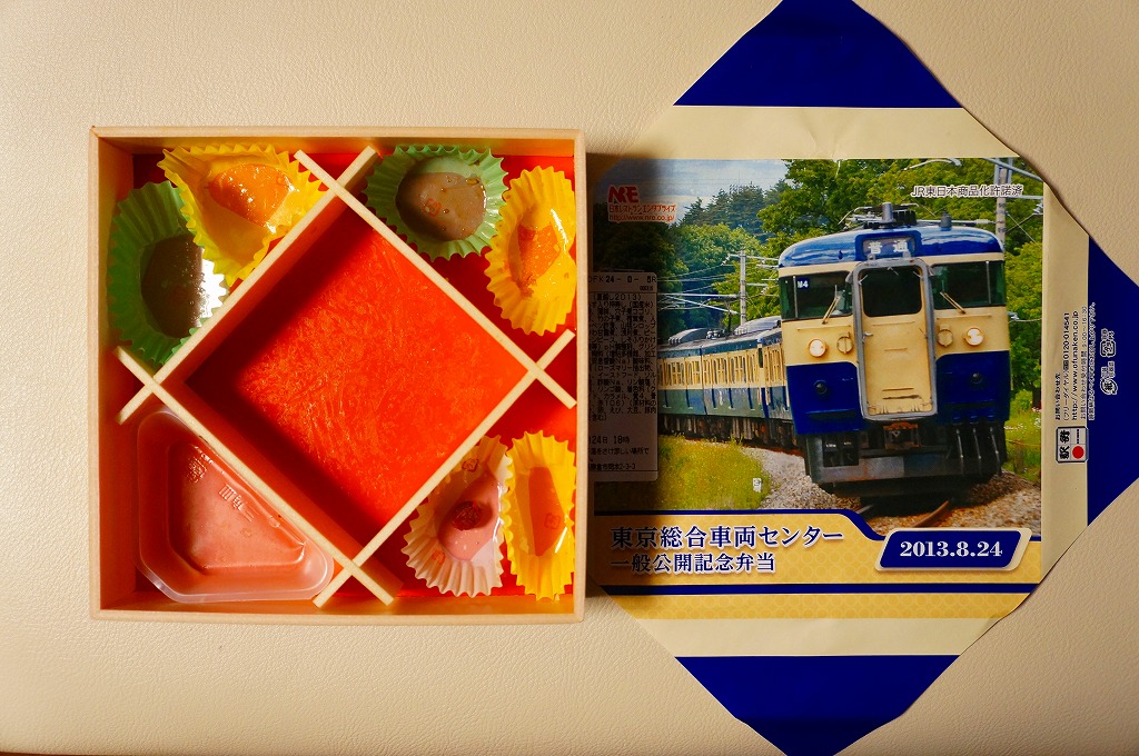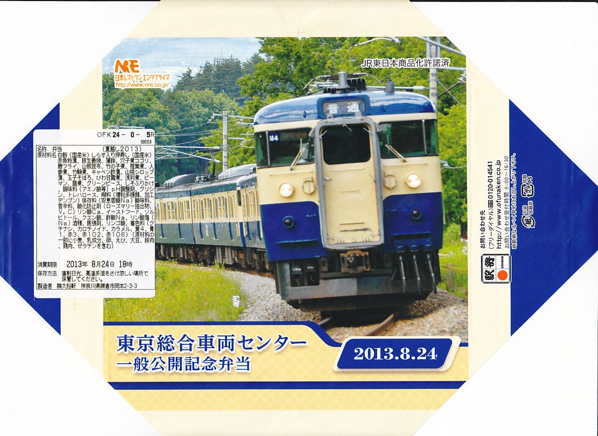 2013(平成25)年8月24日の鉄道工場公開イベントで販売されたお弁当。この年も前年に引き続き、4種類がすべて同じ値段で用意された。掛紙はJR東日本の中央本線の115系近郊形電車。中身は大船駅の夏季限定駅弁「夏越し」。つまり調製元は大船軒で、食品表示ラベルもそうであるが、掛紙にはNREのロゴマークのみが印刷されていた。