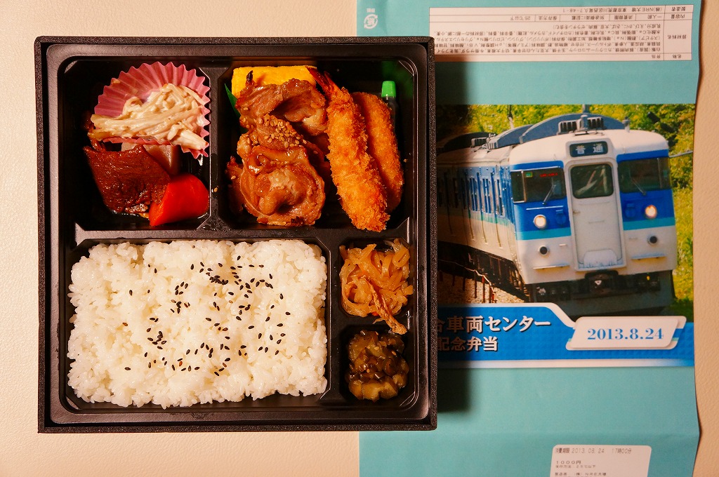 2013(平成25)年8月24日の鉄道工場公開イベントで販売されたお弁当。この年も前年に引き続き、4種類がすべて同じ値段で用意された。掛紙はJR東日本の長野地区の115系近郊形電車。中身は普段「はつらつ」の名称でNREが受注生産している宅配弁当。白御飯に豚肉照焼、エビフライ、カニクリームコロッケ、大豆たんぱく甘辛煮、ごぼうサラダ、切り干しダイコン、玉子焼など。今回の3つのNREの弁当もまた、東京駅でおなじみの安定した味。