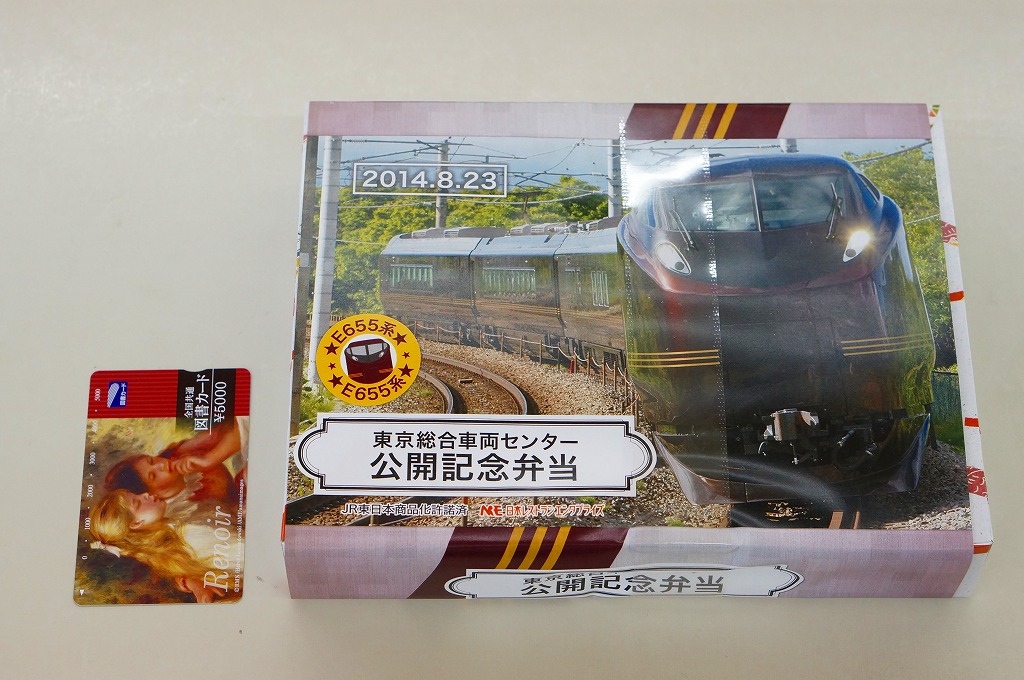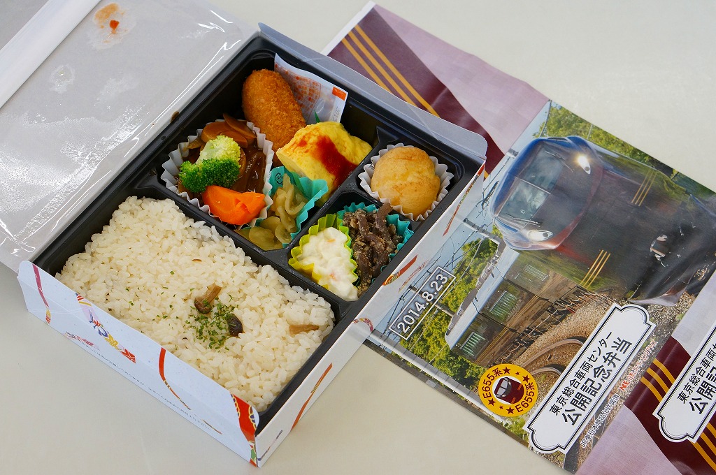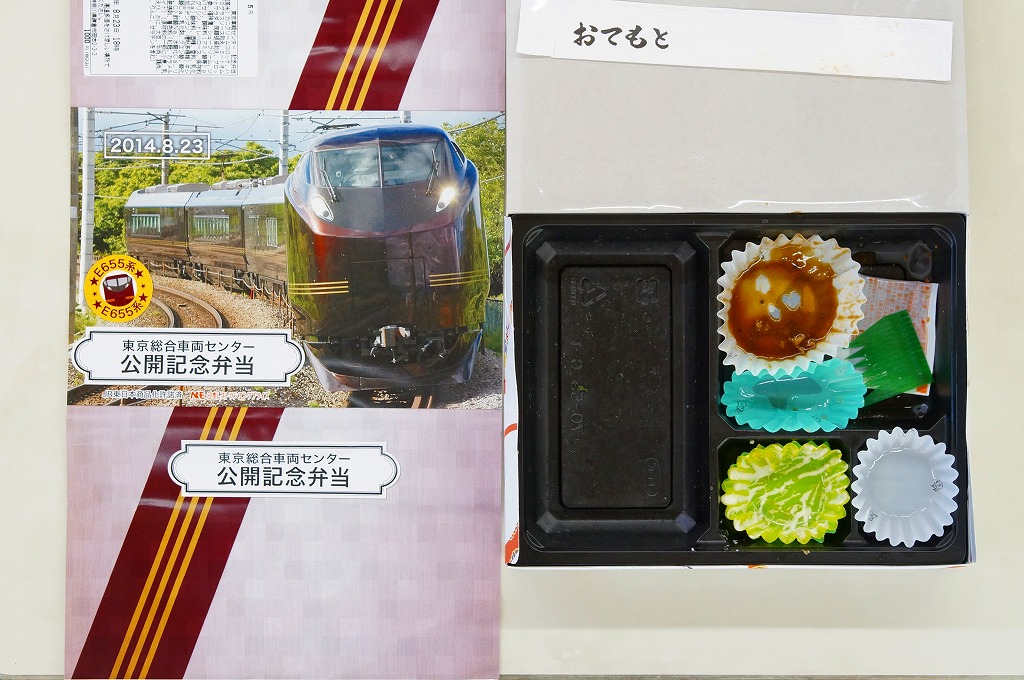 2014(平成26)年8月23日の鉄道工場公開イベントで販売されたお弁当。この年の記念弁当は、NREこそ前年と同じく3種類を用意したが、大船軒のものは無かった。しかしよく見ると、この弁当のみ食品表示ラベル上は、調製元が大船軒である。掛紙は皇室用客車の代替として2007(平成19)年にJR東日本が製造した「ハイグレード車両」E655系電車。