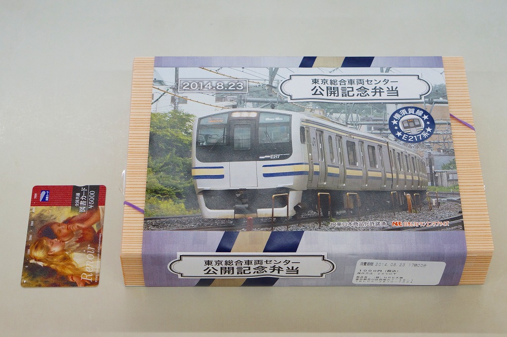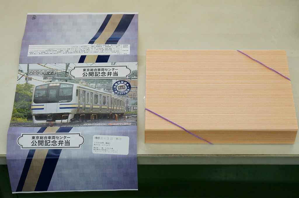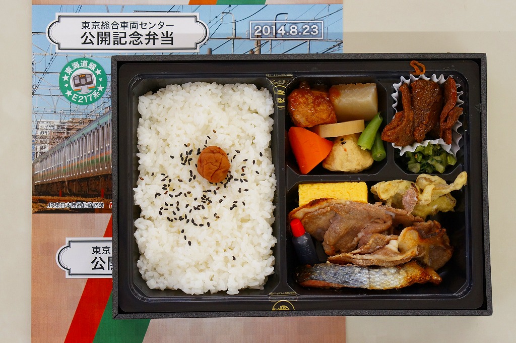 2014(平成26)年8月23日の鉄道工場公開イベントで販売されたお弁当。この年の記念弁当は、NREこそ前年と同じく3種類を用意したが、大船軒のものは無かった。掛紙は総武快速・横須賀線のE217系電車。中身は普段「ありあけ」の名称でNREが受注生産している宅配弁当。日の丸御飯にトンカツ、サワラ西京焼、有頭海老、ニシン昆布煮、玉子焼、がんもやサトイモなどの煮物、マイタケ煮など。