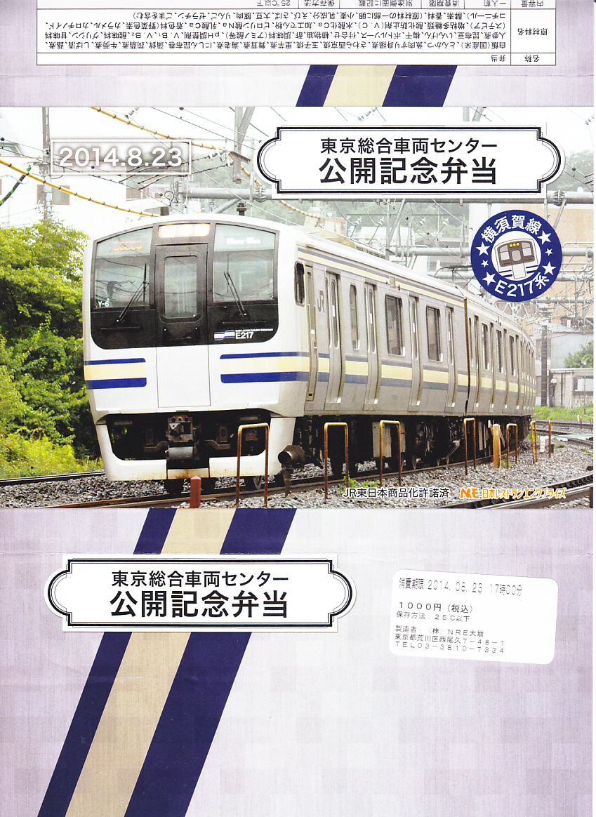 2014(平成26)年8月23日の鉄道工場公開イベントで販売されたお弁当。この年の記念弁当は、NREこそ前年と同じく3種類を用意したが、大船軒のものは無かった。掛紙は東海道本線のE217系電車。中身は普段「さがみの」の名称でNREが受注生産している宅配弁当。日の丸御飯にサーモン味噌焼、豚生姜焼、玉子焼、がんもやニンジンなどの煮物、マイタケ天ぷら、大豆たんぱく甘辛煮など。