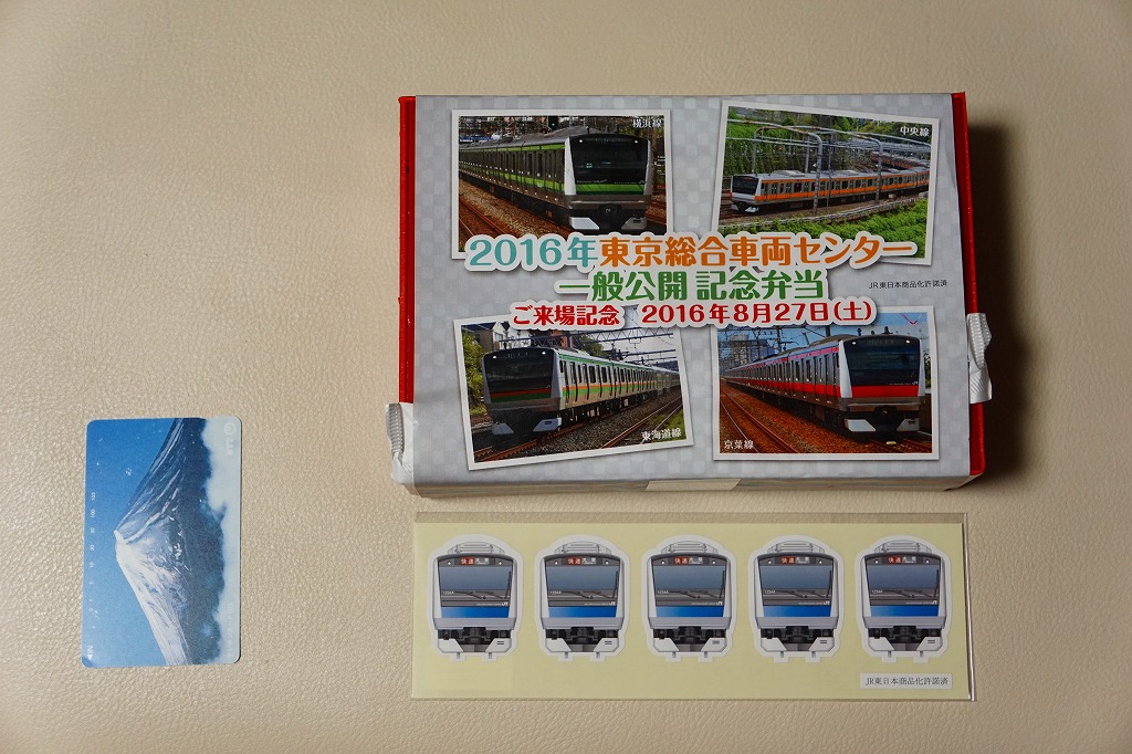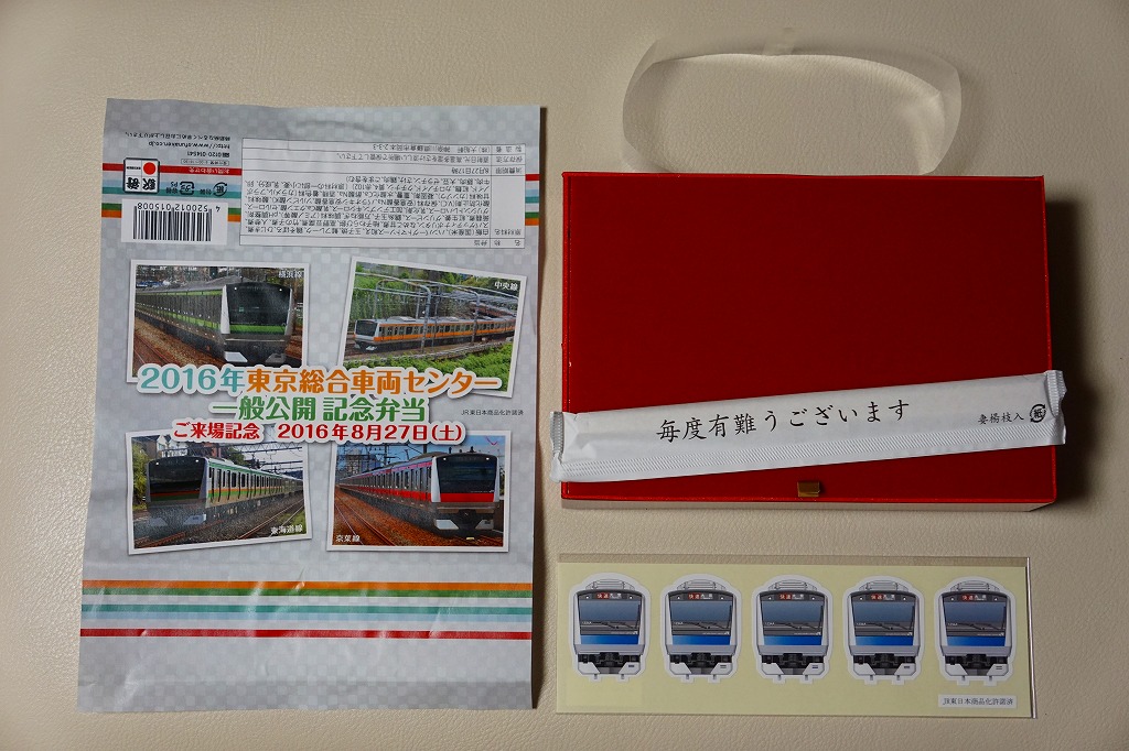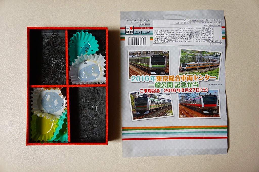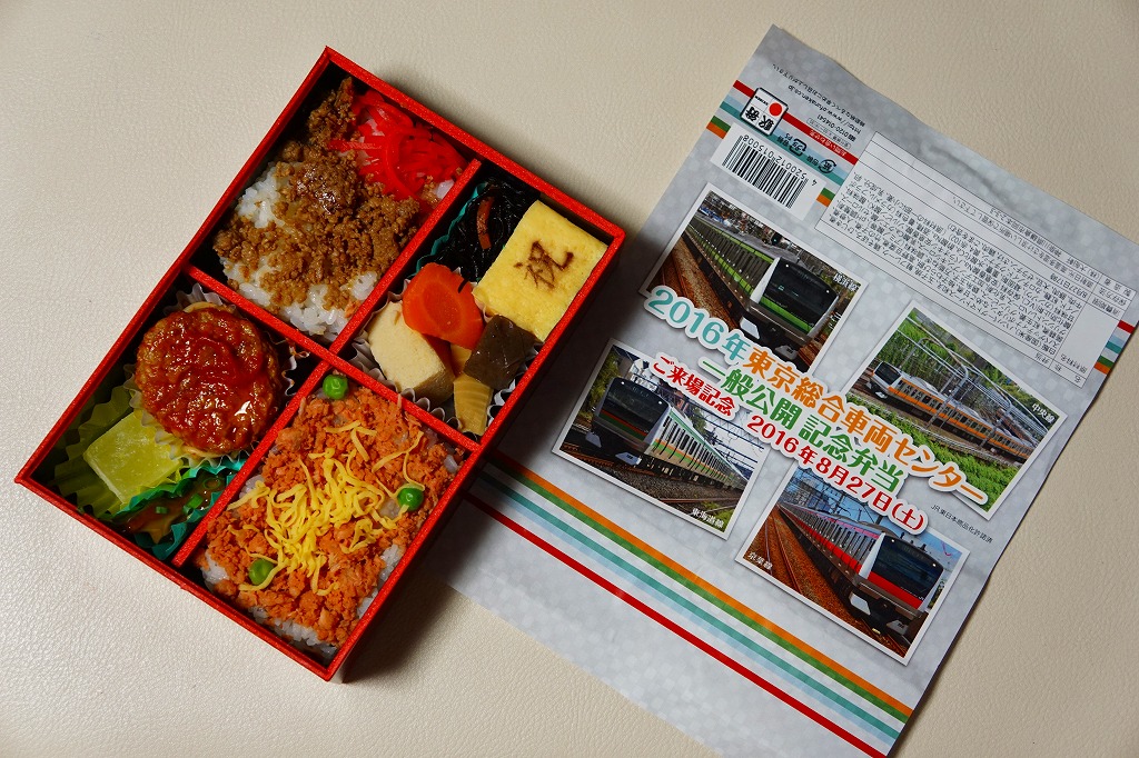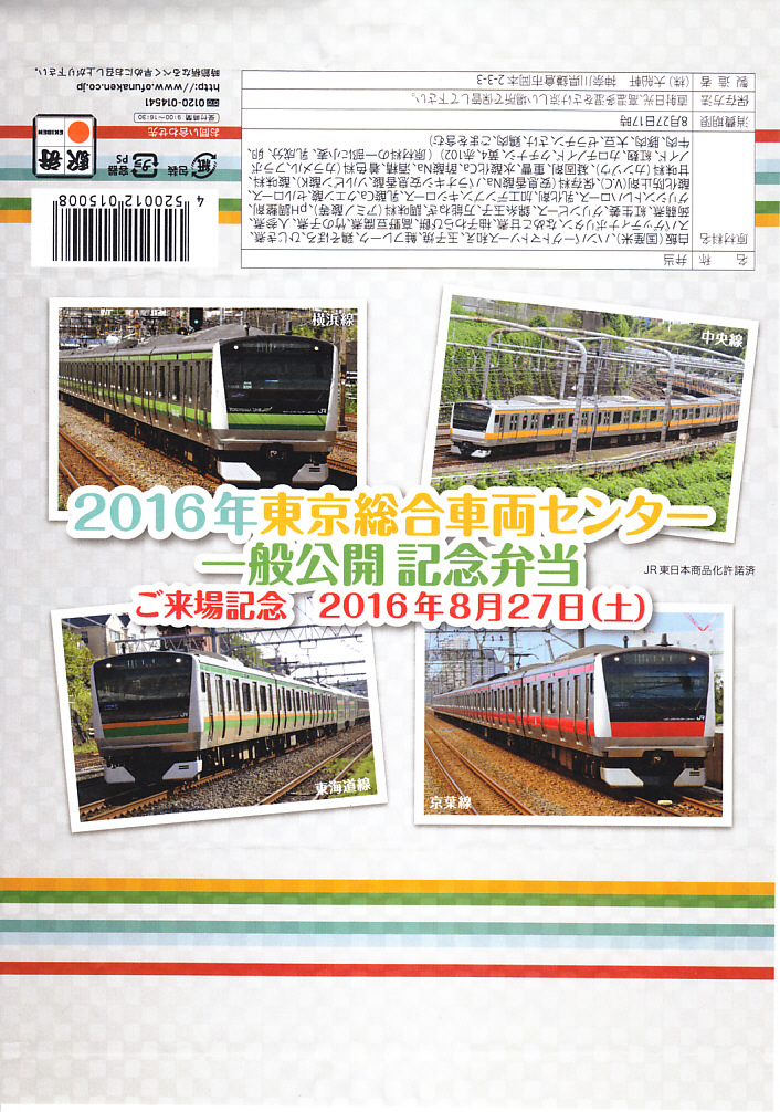2016(平成28)年8月27日の鉄道工場公開イベントで販売されたお弁当。この年の記念弁当は大船軒の1種類しかなく、NREの東京駅弁もあまり多くなく、遠く兵庫県神戸の淡路屋の新幹線型容器の駅弁が幅を利かせていた。前年は不参加だが、1種類だけ、山手線E235系電車の掛紙を使う記念弁当が出ていた模様。掛紙の写真は、横浜線、中央線、東海道線、京葉線のE233系電車。掛紙の裏面には、E233系の運用線区らしくない、埋立地でなさそうな海沿いを走る風景の塗り絵が印刷された。