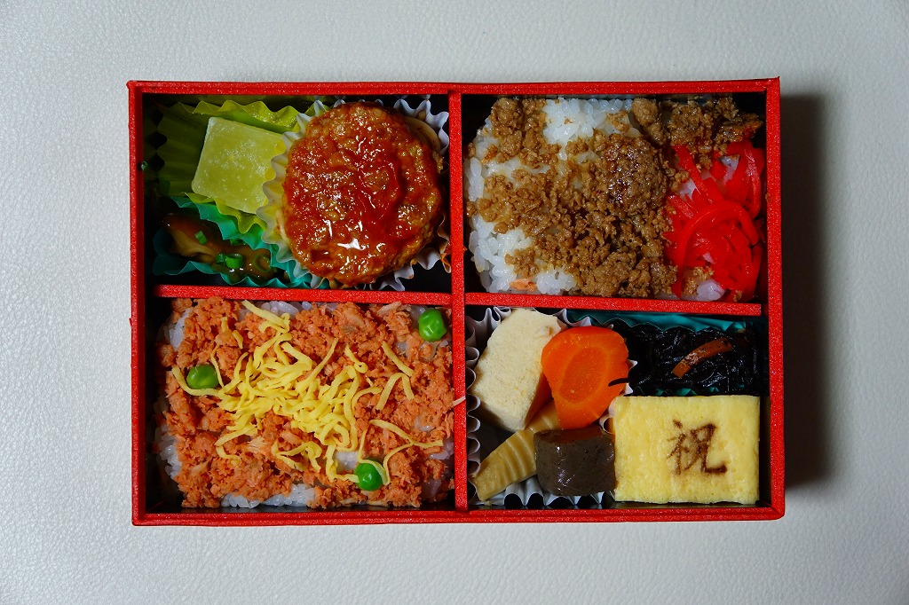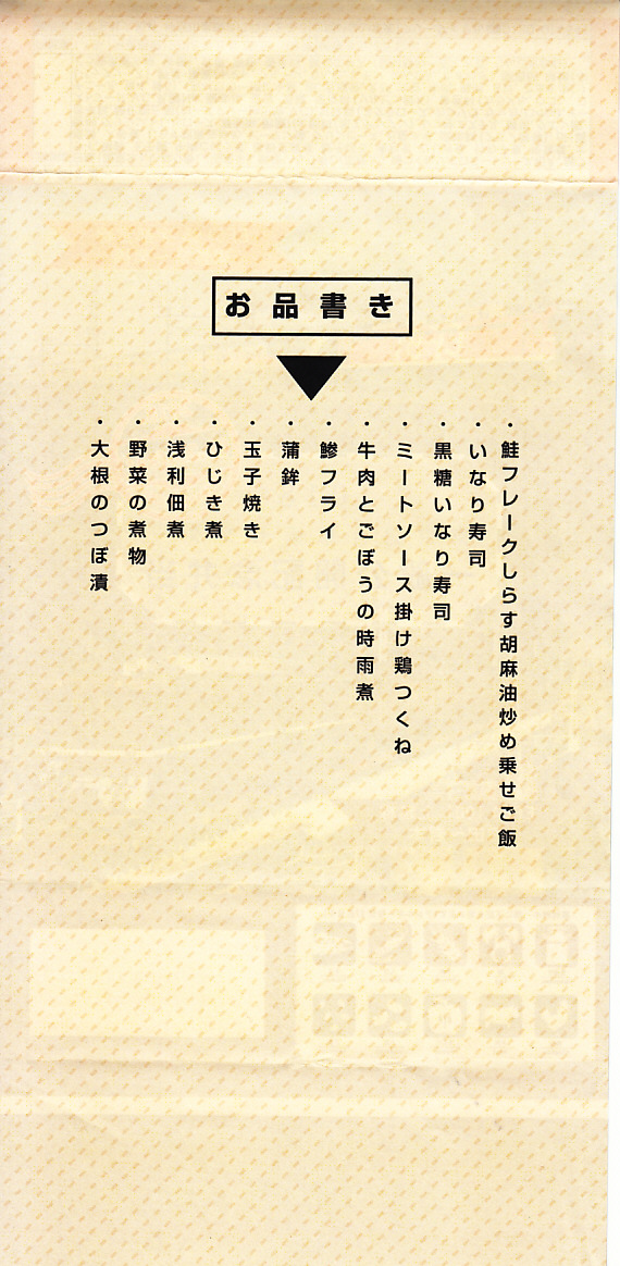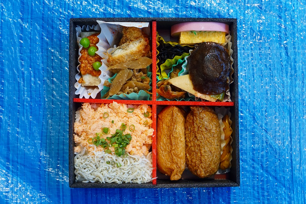 4区画の中身は掛紙の裏面に記され、鮭フレークとシラス油炒めで覆う白飯、いなり寿司と黒糖いなり寿司、ひじきとアサリとかまぼこと玉子焼と野菜の煮物、ミートソース鶏つくねとアジフライに牛肉とどぼうの時雨煮などを詰めていた。イベントと中身の関連はないようだが、味と中身で近年では最も、特製弁当という感じがしたと思う。