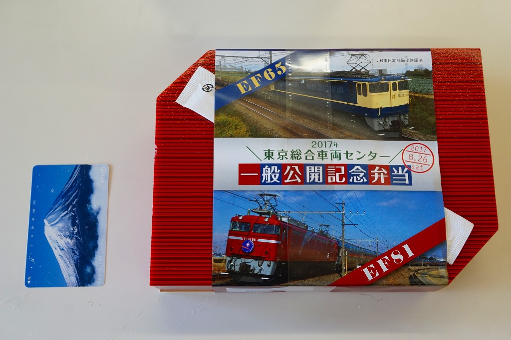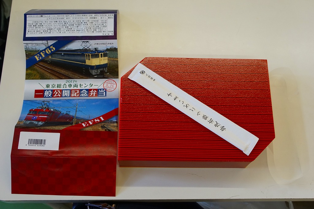 2017(平成29)年8月26日の鉄道工場公開イベントで販売されたお弁当。この年も、記念弁当はこの1種類のみ。ネット上にEF65とEF81の記念弁当が出るとあり、今年は久々に複数の公開記念弁当が出るのかと思ったら、実物では1枚の掛紙にEF65とEF81の写真を載せていた。