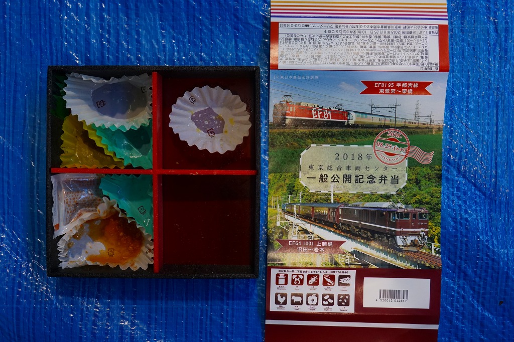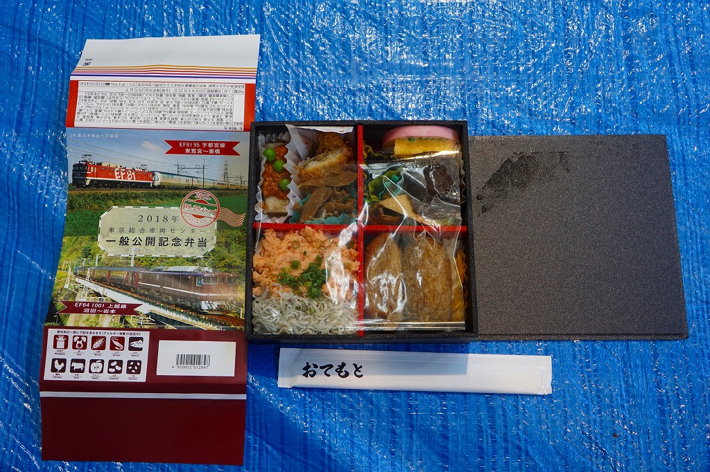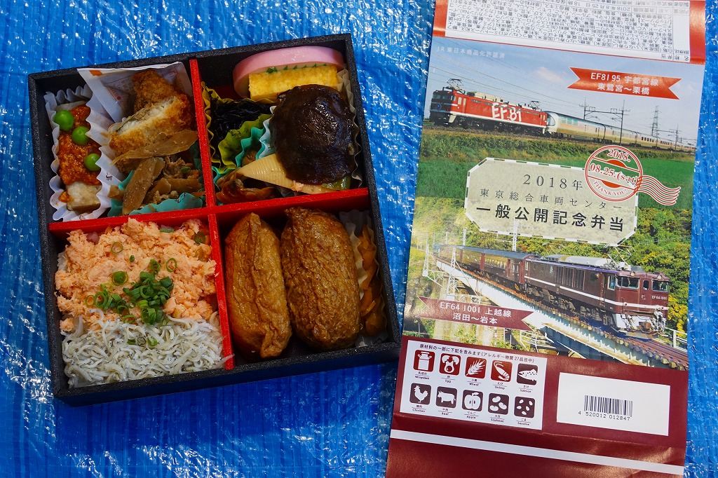 2018(平成30)年8月25日の鉄道工場公開イベントで販売されたお弁当。他に東京駅のキャラクターや新幹線型容器の駅弁も売っていた。掛紙は赤い電気機関車EF8195が牽くカシオペア向け寝台客車と、茶色い電気機関車EF641001が牽く旧型客車の走行写真。
