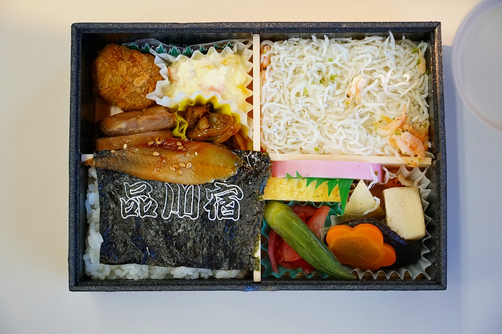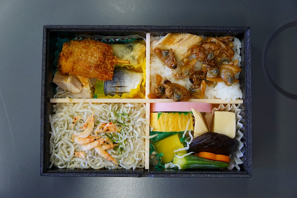 4区画の中身は、「品川宿」と印刷した海苔で覆う白飯とアナゴ、サクラエビを載せたシラス御飯、野豆腐と野菜の煮物に蒲鉾と玉子焼と大根漬、鎌倉ハムのポテトサラダとくじらカツとアサリしぐれ煮と豚ヒレ焼。品川・江戸前に縁のある食材と大船軒人気の食材を詰め合わせたとする、風変わりな幕の内タイプの駅弁。