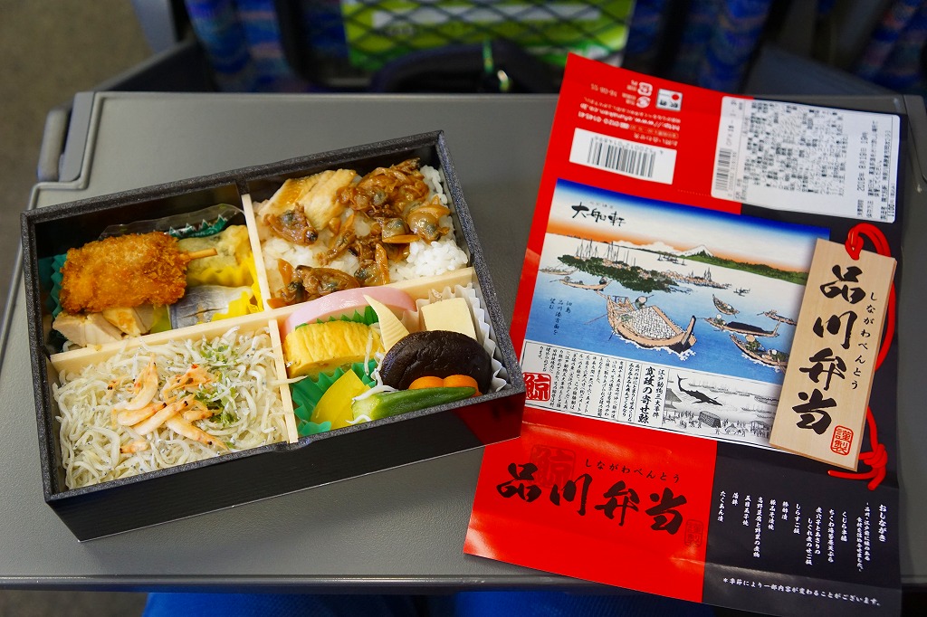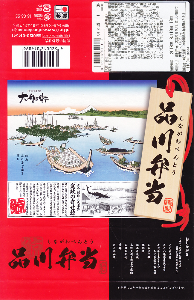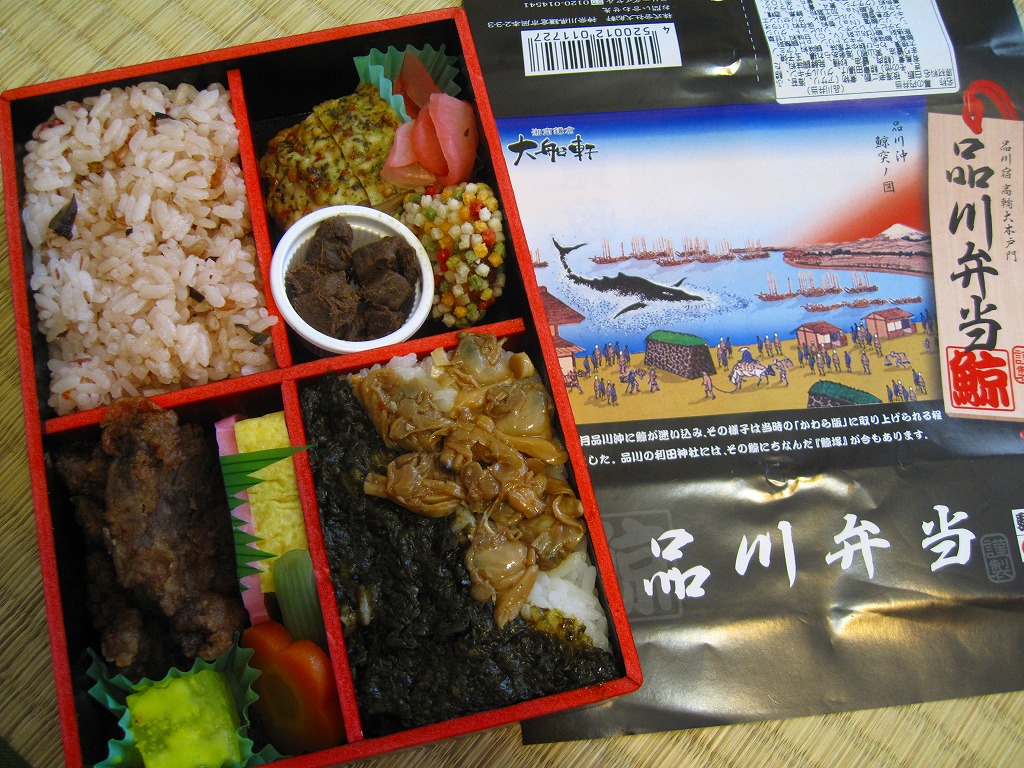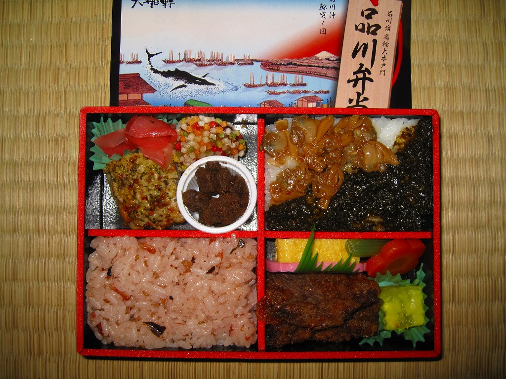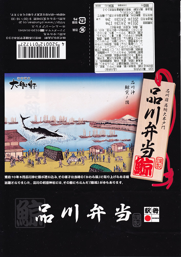 上記の駅弁「品川弁当」の、2018(平成30)年時点での姿。掛紙には「江戸動物三大事件 寛政の寄せ鯨」として、寛政10年(1798)年の東京湾でのクジラ出現騒動の頃のものに見える絵柄や説明文と、駅弁の名前やおしながきを描く。4区画の中身は、サクラエビを載せたしらす御飯、煮穴子とあさりのしぐれ煮のせ御飯、くじら串揚とちくわ天とアジ酢漬けと豚みそ漬焼、高野豆腐やシイタケなどの煮物とかまぼこと玉子焼など。