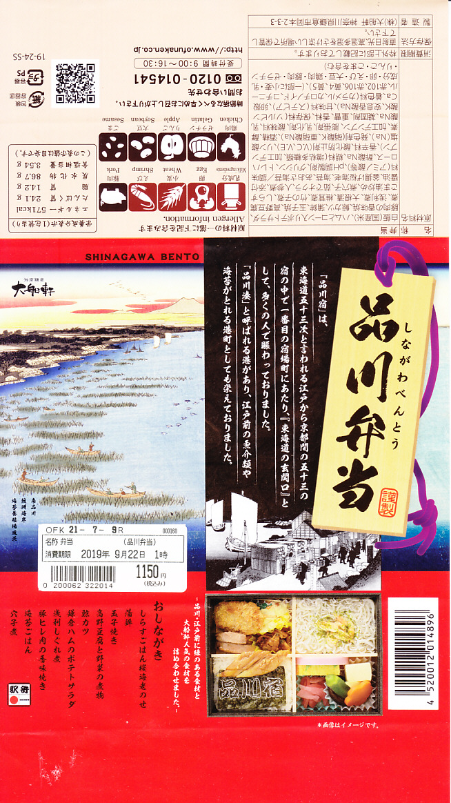 2019年9月21日に購入した、品川駅弁の掛紙。上記のものと半年しか違わないので、まったく同一かと思ったらそうではなく、アレルギー表記に関する記載が少し異なる。値段や中身は同じ。