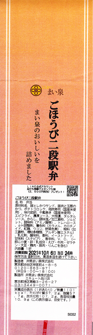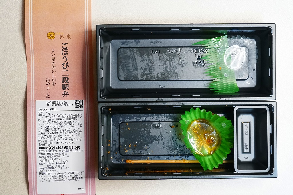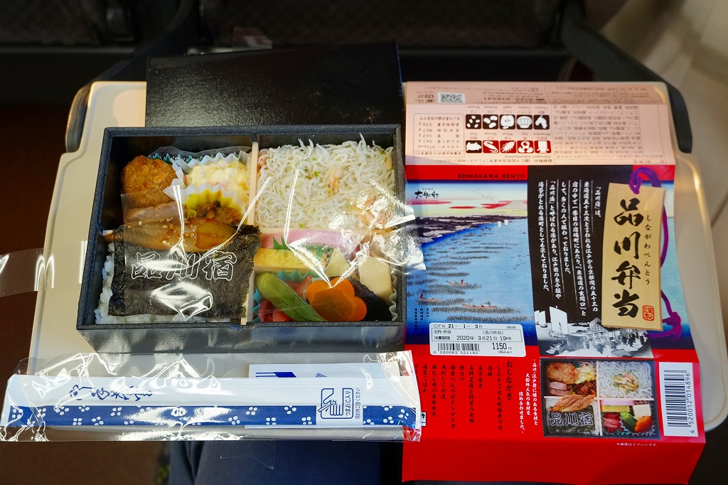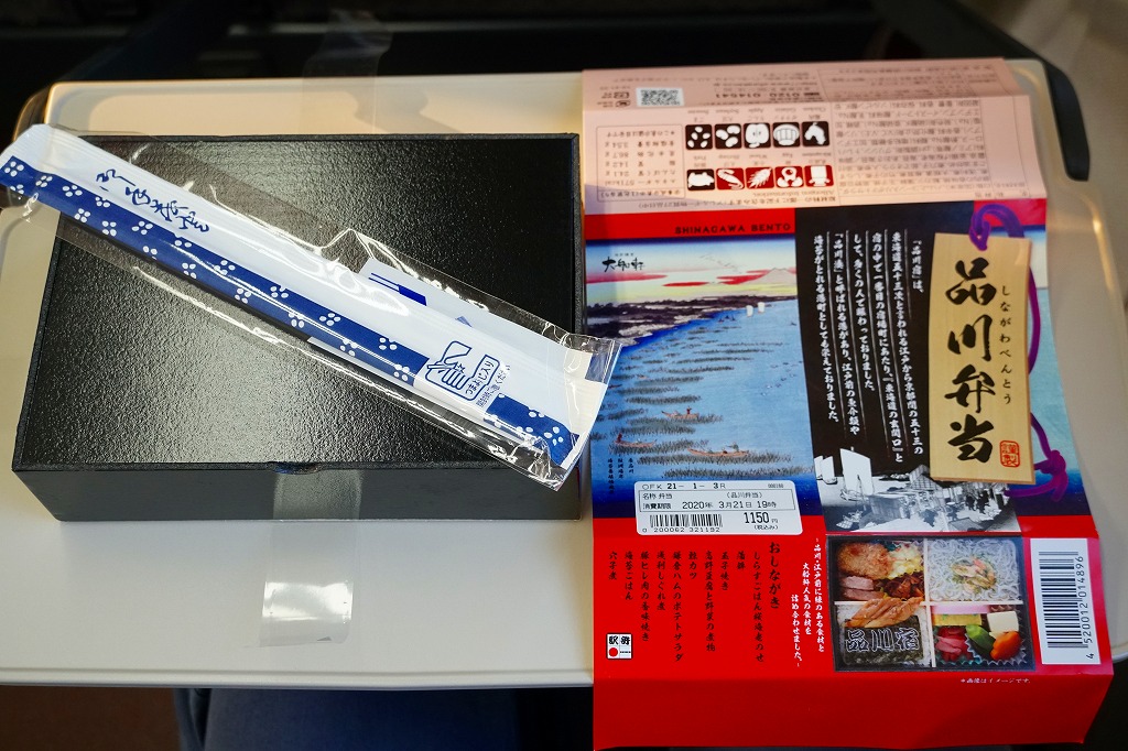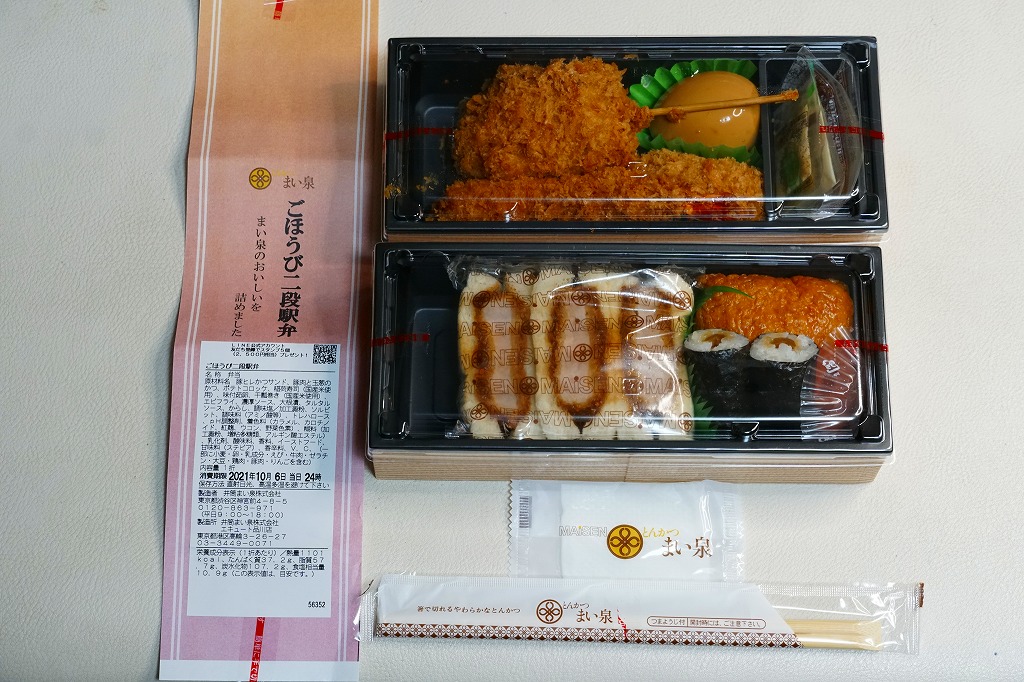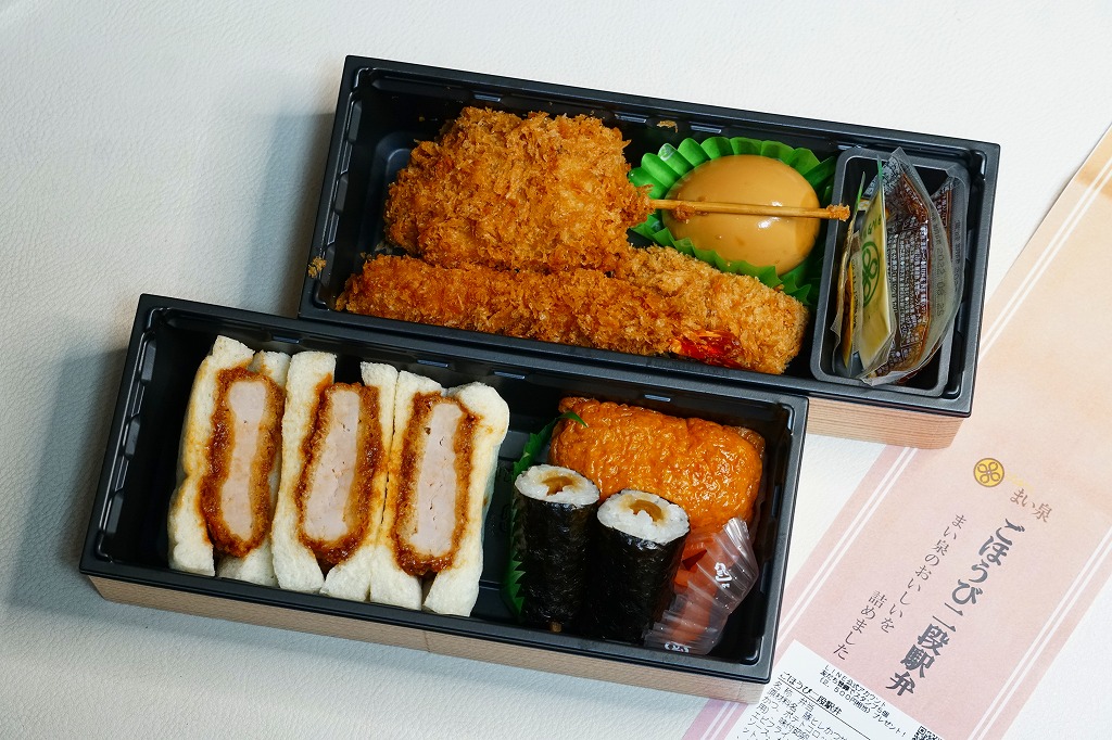 2020(令和2)年の春までに品川駅で発売か。東京のデパ地下やエキナカのどこにでもあるとんかつ店「まい泉」の弁当であり、しかしこれはどうも品川駅限定で売られるらしく、なんといっても商品名に「駅弁」を含むので、品川駅の駅弁に見えてくる。中身は小柄な長方形のプラ容器を二段に重ねて、下段にまい泉のヒレかつサンド、いなりずし、かんぴょう細巻、大根漬、上段に煮玉子、エビフライ、タマネギの串カツ。駅弁でなくまい泉の柔らかとんかつの味と、まい泉の弁当では見ない食材が含まれる。