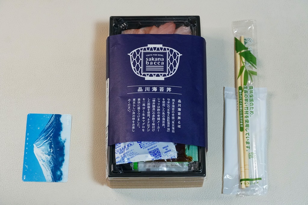 品川駅構内の商業施設「エキュート品川」には2019(平成31)年3月22日に出店した鮮魚店テナント「サカナバッカ」で、品川駅限定のお弁当として発売。駅弁でもよく使われる長方形のプラ容器に、お店のロゴマークと品川海苔丼の説明文を記した青い掛紙を巻く。中身はその記述を借りると、酢の老舗メーカー「横井醸造」の赤酢で味付けした酢飯を、焼き海苔の老舗「東京蒲田守半」の「本場大森乾海苔 頂」で覆い、アジを一尾分と生本マグロを豪快に盛り付けたもの。これにしょうゆ、おろししょうが、おろしわさび、甘酢がりで4袋も添付。上げぶた上げ底でなく、ブロック状の刺身をいただく、駅弁や催事にないタイプの海鮮丼。他に「季節のばらちらし」と「べっこう丼」を発売したという。価格は2019年の発売時で1,480円、2023年の購入時で1,580円。