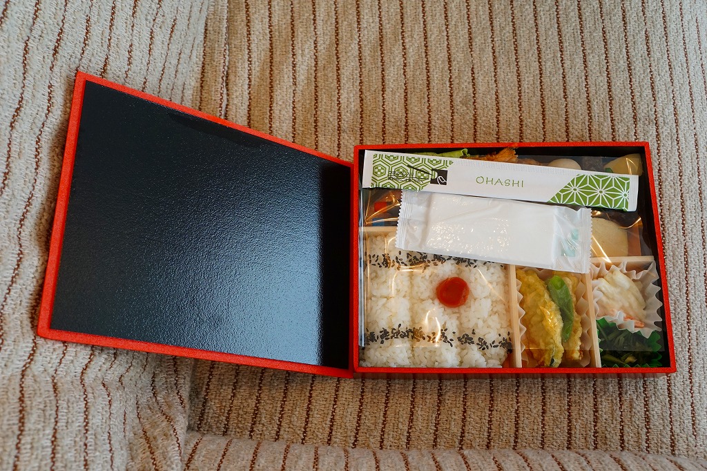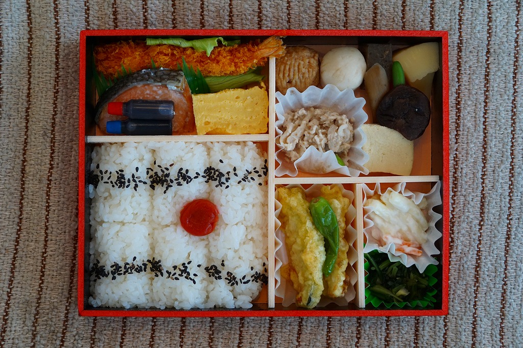常盤軒フーズの仕出し弁当の、「復刻駅弁シリーズ」のひとつ。中身は日の丸御飯に焼鮭と玉子焼、エビフライ、カボチャとちくわの天ぷら、ししとう、肉団子、サトイモやニンジンなどの煮物、豚しゃぶ、マカロニサラダ、漬物など。これが「大正12年創業」の「ロングランの幕の内」「一世を風靡した駅弁の味」といい、たしかにかつて品川駅で売られた駅弁「品川御膳」とよく似ている。