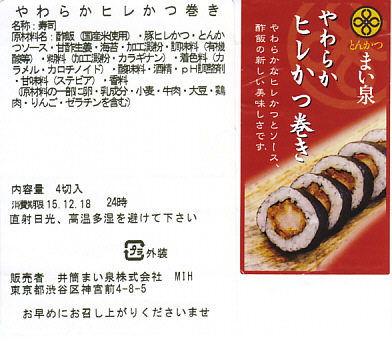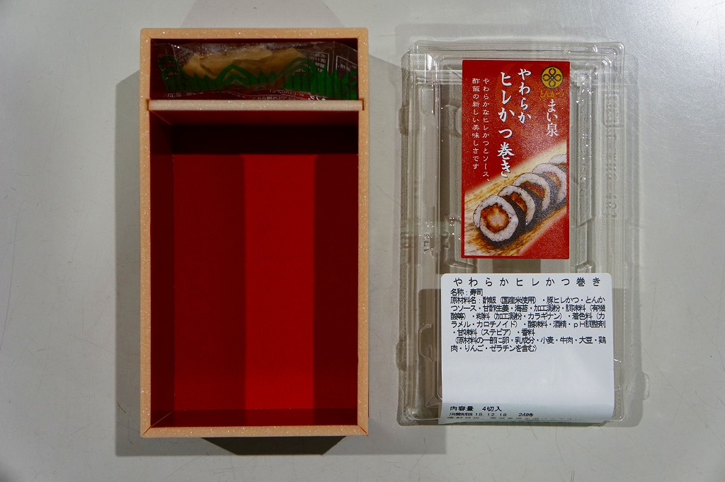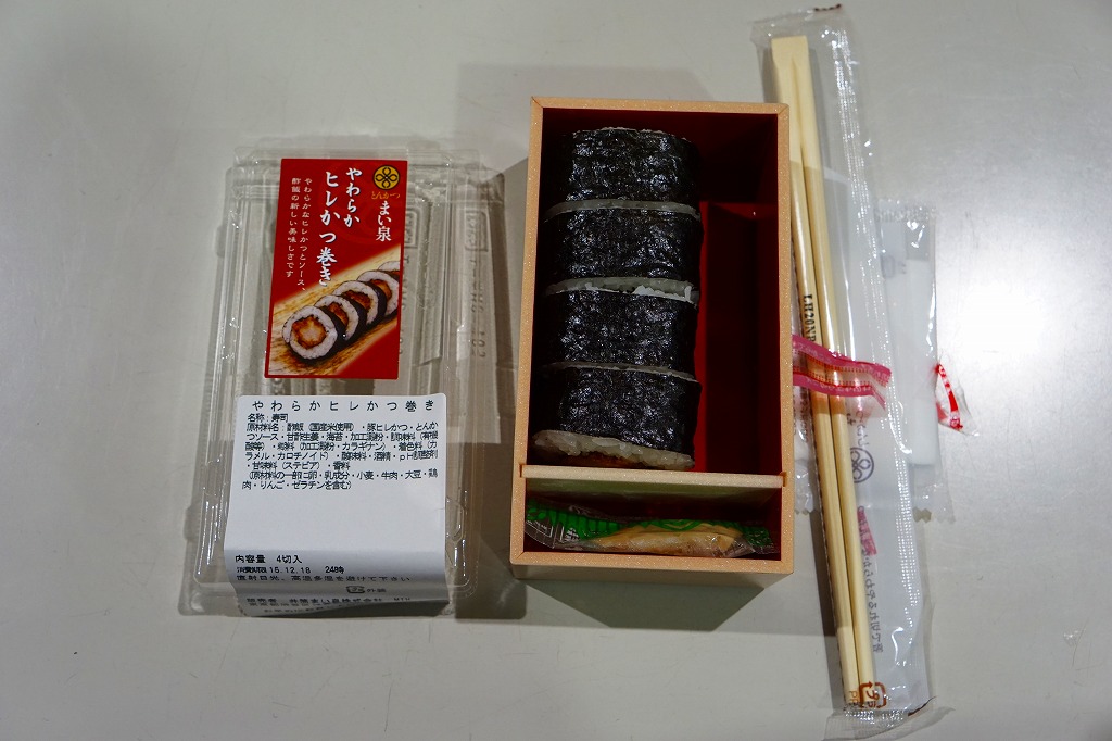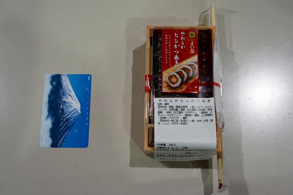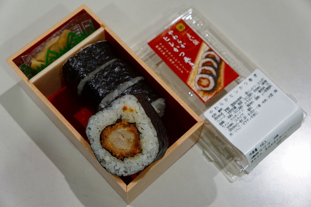 これは駅弁ではなく、駅構内の商業施設のテナントの弁当あるいは惣菜。品川駅の駅弁屋が、夕刻にして全品完売で開店休業の体たらく、そこで隣接するエキナカに走った。東京や近郊の各地に店舗網を広げる、まい泉の商品であるから、品川駅や東京駅やその他各地で買える商品だと思われる。中身は小さなシールの写真のとおり、ひれかつを海苔で巻き、酢飯を巻いてさらに海苔で巻いた太巻きが1本。このチェーン店の商品どおり、カツは飯と同じくらいの柔らかさ。駅で買えば、駅弁に見えなくもない商品。