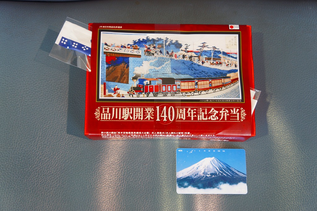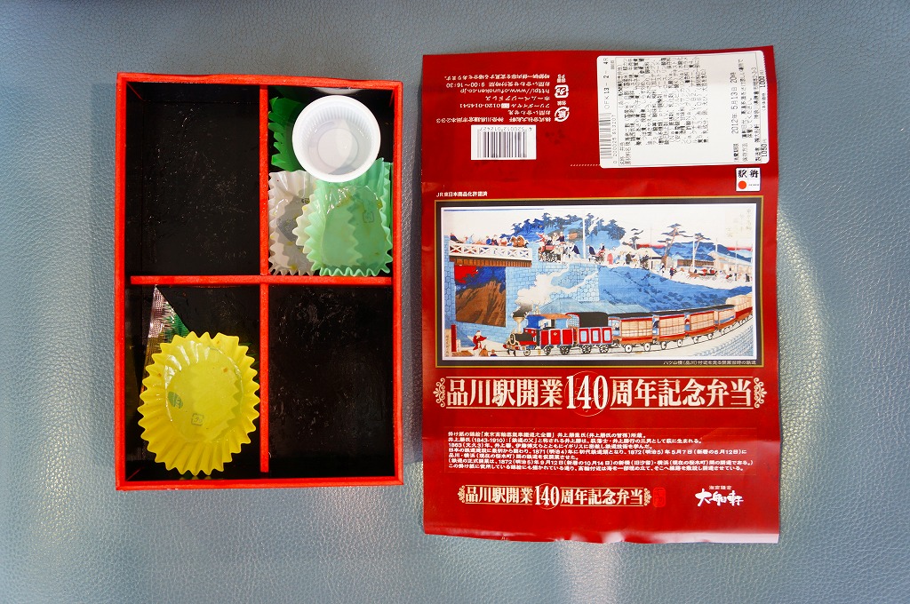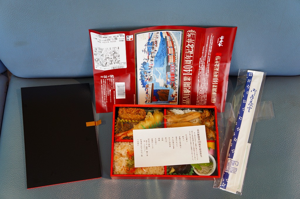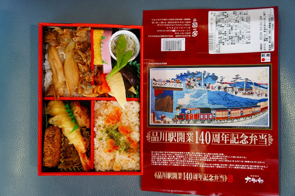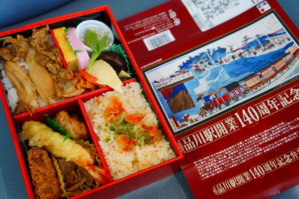 駅弁の名前のとおり、品川駅開業140周年を記念して、2012(平成24)年5月7日から6月17日まで品川駅で販売された記念駅弁。このキャンペーンでは他に、「品川駅開業140周年記念品川ステーションビール」(500円)の販売や、団体専用列車「品川駅開業140周年記念号」の運転も実施された。朱色の長方形の容器に、昔の品川駅付近を描いた錦絵を印刷した掛紙で巻く。