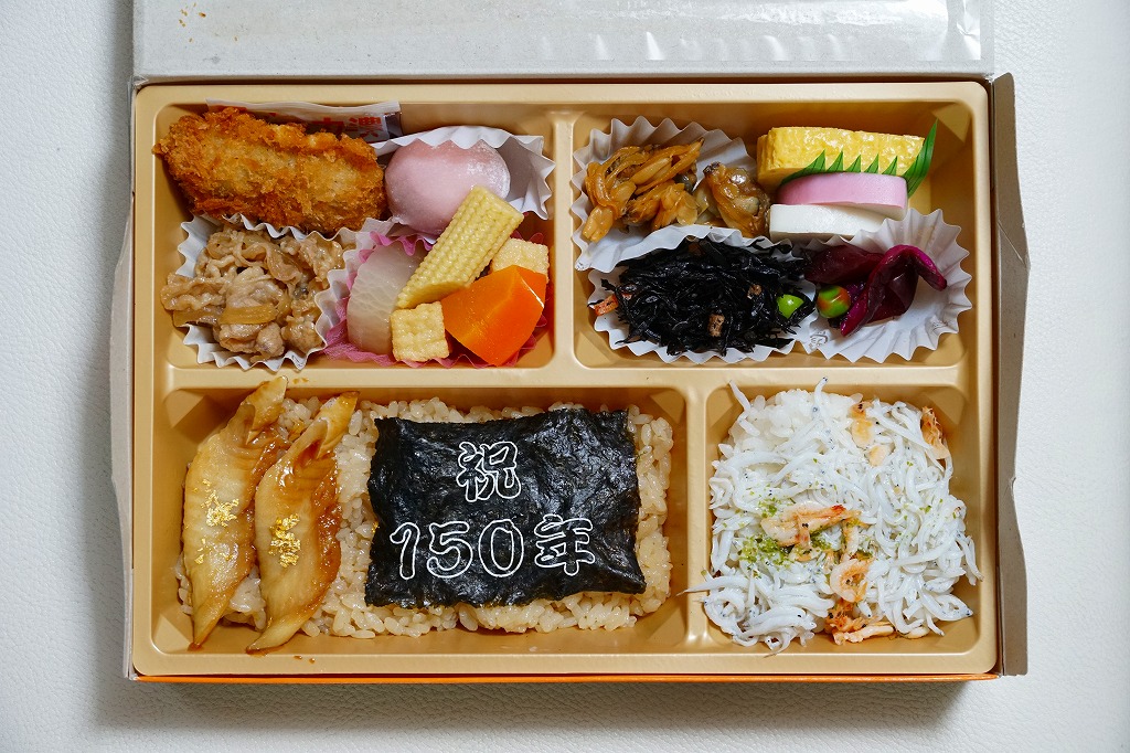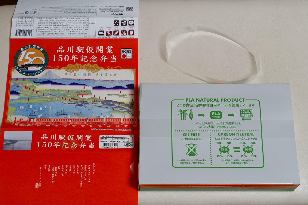 2022(令和4)年6月1日から8月まで、8,000個を販売。駅弁の名前にあるとおり、掛紙に書かれるとおり、1872年6月12日(明治5年5月7日)の品川駅仮開業から150年を記念する弁当。品川駅で駅弁売店「駅弁屋品川」を担当している可能性のある大船軒が品川駅でこの駅弁を市販し、品川駅にも店舗がある横浜駅弁の崎陽軒は6月10日から12日まで完全予約制の商品「品川駅仮開業150年記念弁当」(1,300円)を沿線で2,700個販売した。
