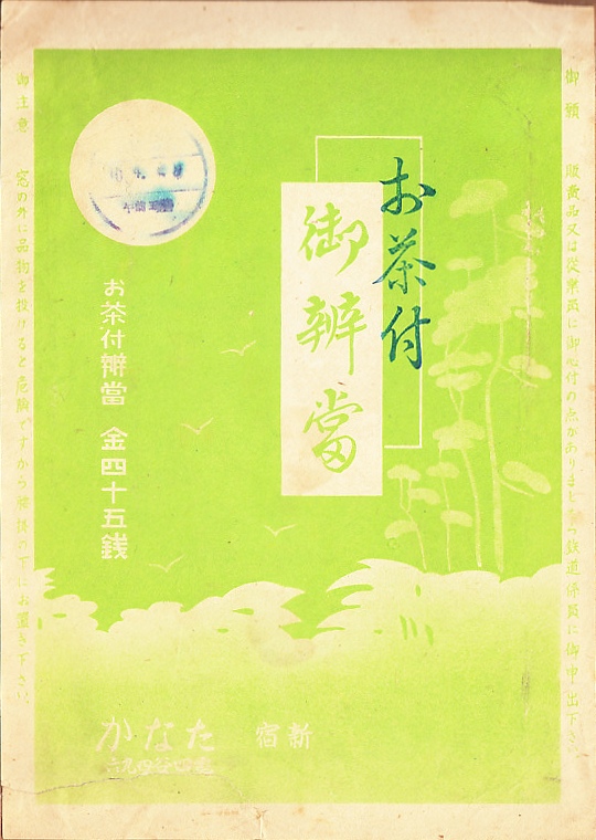 お茶付き弁当とは、1939(昭和14)年頃から第二次大戦中までの駅弁にみられたもの。当時30銭の駅弁と10銭のお茶を合計45銭で販売したのは、当時は鉄道省が決めていた駅弁やお茶の値段を、国家総動員法に基づく価格等統制令により1939(昭和14)年9月18日の価格に凍結されてしまったため、これを回避するため新たな商品を出したものらしい。