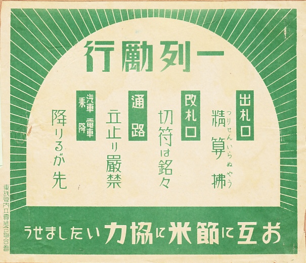 1941(昭和16)年4月28日5時の調製と思われる、昔の新宿駅弁の掛紙。おかずの掛紙は、おそらく特に何かを描いているわけではないと思われる。御飯の掛紙は鉄道省の東京鉄道局管内の各社で共通のもので、駅弁の掛紙では第二次大戦中に呼び掛けられた、汽車や電車の客に向けたマナー啓発。
