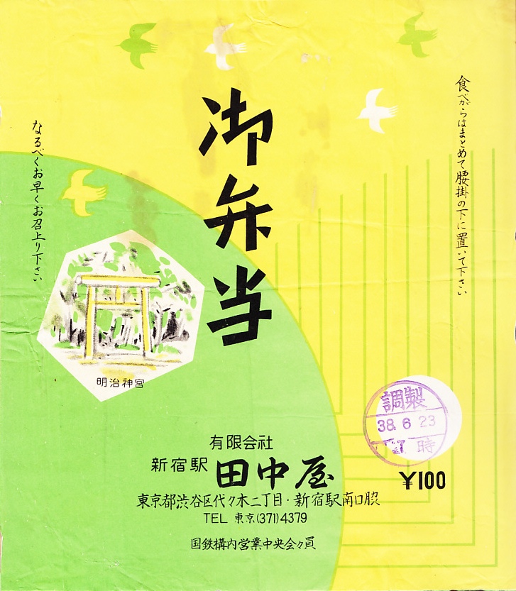 1963(昭和38)年6月23日7時の調製と思われる、昔の新宿駅弁の掛紙。小さな絵柄には明治神宮と書いてあるが、これではなんだか町外れの小さな神社にしか見えない。