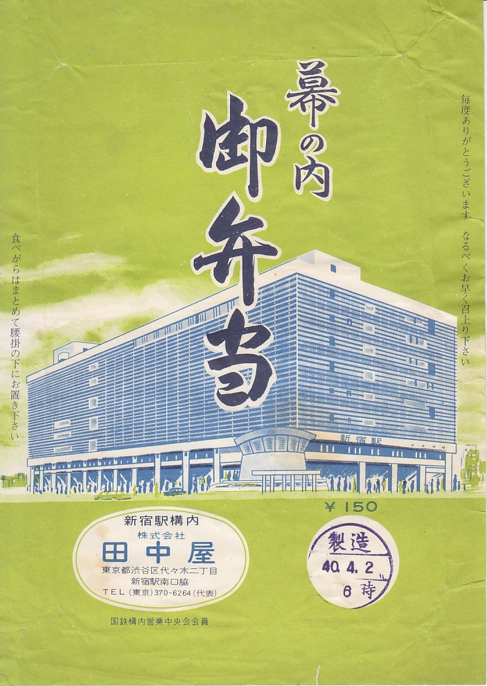 1965(昭和40)年4月2日(金)6時の調製と思われる、昔の新宿駅弁の掛紙。2025年時点で「ルミネエスト新宿」として現存する、新宿駅ビルの当時の姿を描く。