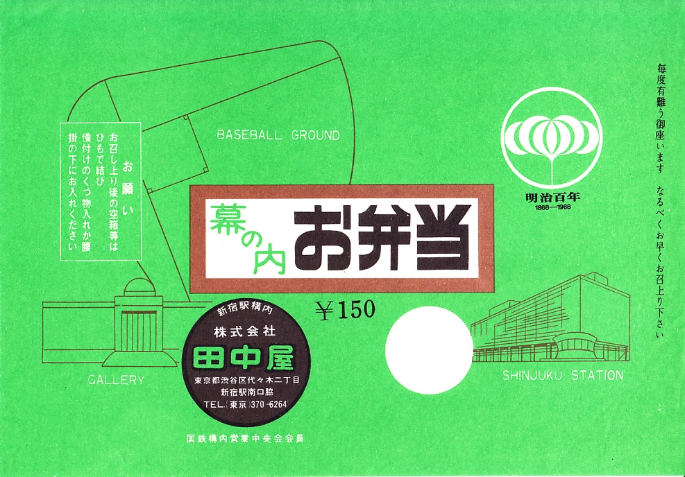 記載事項から1968(昭和43)年のものと思われる、昔の新宿駅弁の掛紙。BASEBALL GROUNDとGALLERYとSHINJUKU STATIONを描いた、近代的な絵柄。1968年の明治百年のロゴマークもある。
