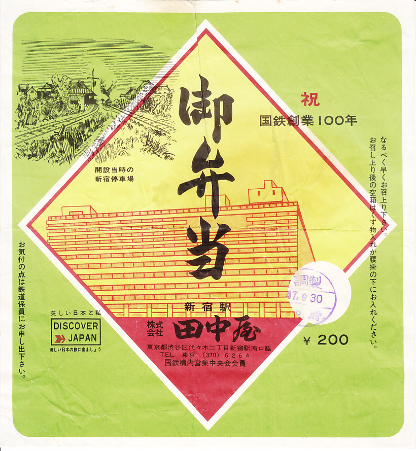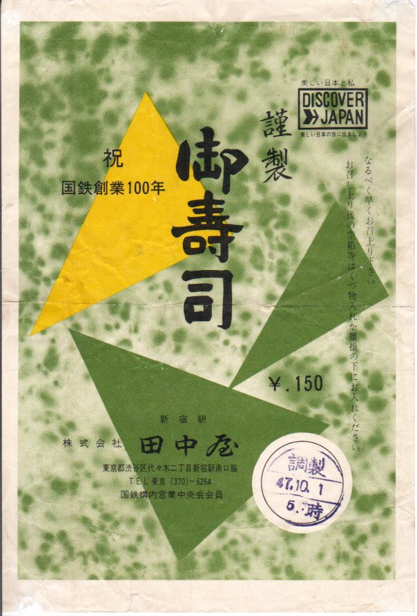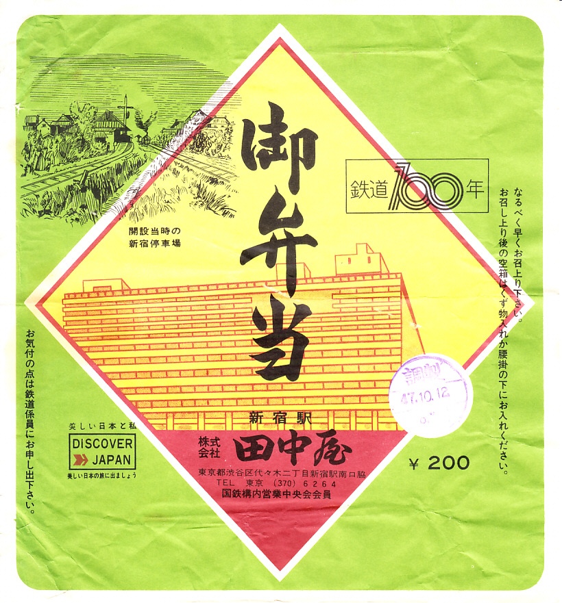 1972(昭和47)年10月12日の調製と思われる、昔の新宿駅弁の掛紙。絵柄は下記の9月のものと同じ。国鉄の観光キャンペーン「ディスカバー・ジャパン」に加えて、この年この月の鉄道100年のロゴマークも印字された。