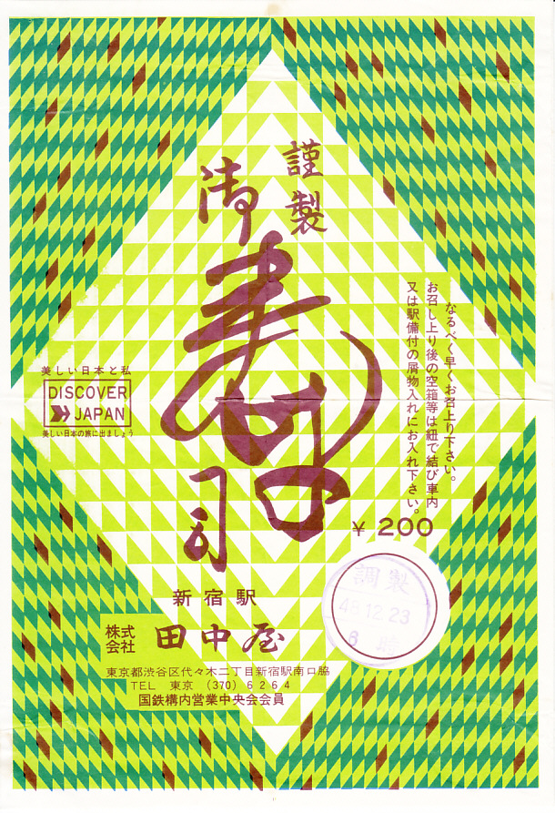 1973(昭和48)年12月23日の調製と思われる、昔の新宿駅弁の掛紙。掛紙だけを正視すれば目がチカチカしそうな背景。