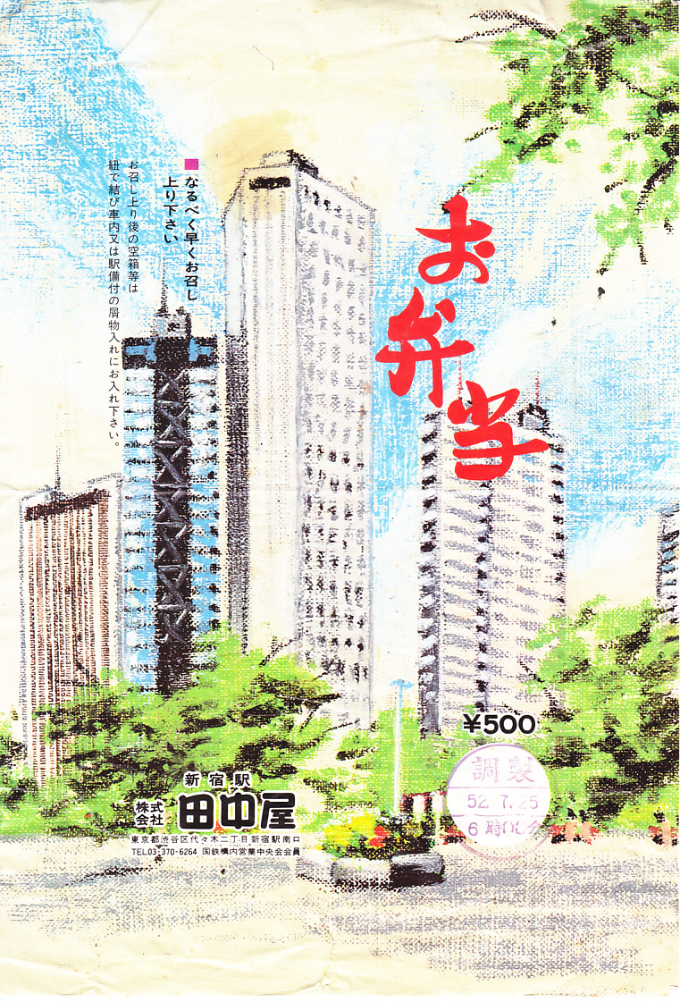 1977(昭和52)年7月25日6時の調製と思われる、昔の新宿駅弁の掛紙。絵柄は当時の新宿中央公園から見た超高層ビル群、左から安田火災海上本社ビル、新宿三井ビルディング、新宿住友ビルディング、京王プラザホテルに見えるがどうか。1898(明治31)年12月に東京の外れにできた淀橋浄水場は、周辺が大正時代には早くも都市化、新宿副都心計画により1965(昭和40)年3月限りで廃止され、跡地は縦横の街路が立体交差する摩天楼街と公園になった。