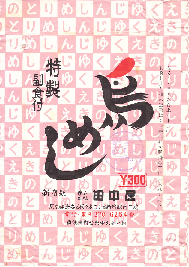 1978(昭和53)年7月25日6時の調製と思われる、昔の新宿駅弁の掛紙。下記のちょうど1年前の「特製副食付鳥めし」に比べて、調製元の表記が手書き風から活字タイプに整えられた。