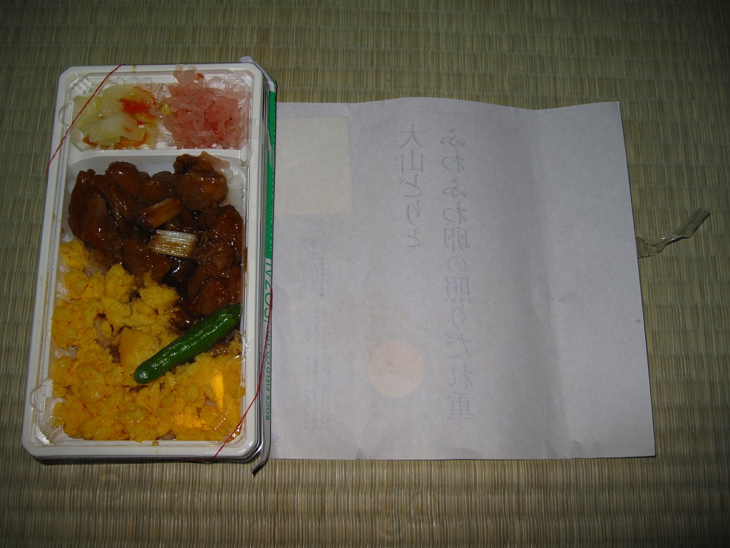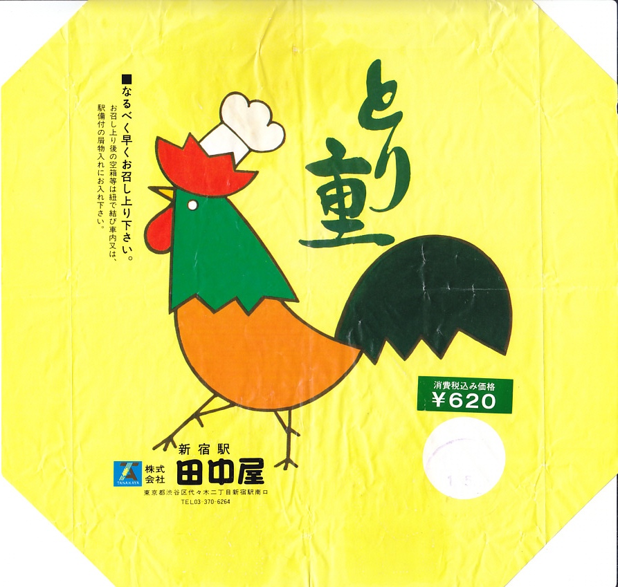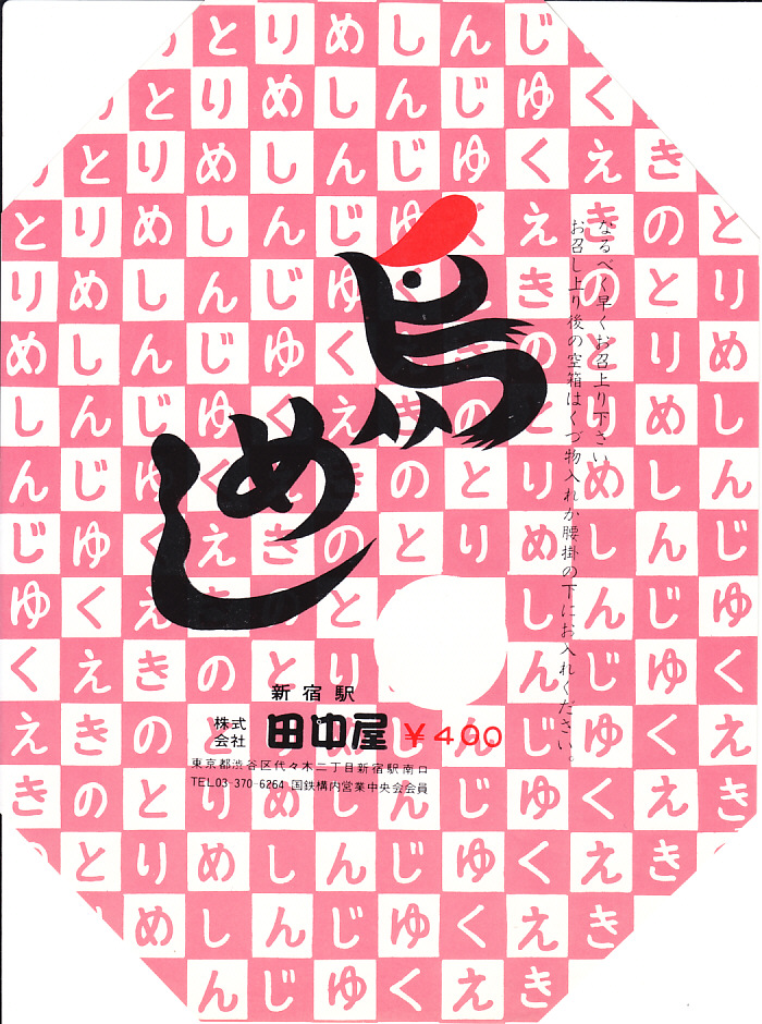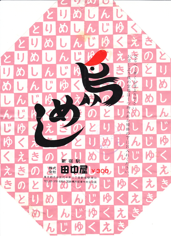 1980年代のものと思われる、昔の新宿駅弁の掛紙。当然といえば当然だが、この絵柄が上記の復刻版に流用された。中身もほぼ同じ。