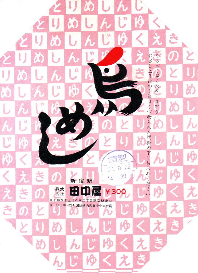 1979(昭和54)年9月22日14時30分の調製と思われる、昔の新宿駅弁の掛紙。下記の1978年7月のものと比べて、調製印の白抜きができた。
