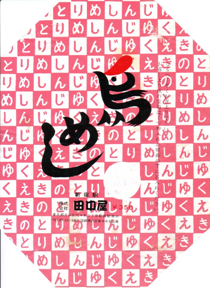 1981(昭和56)年7月18日8時の調製と思われる、昔の新宿駅弁の掛紙。上記や下記のものと変わらない。