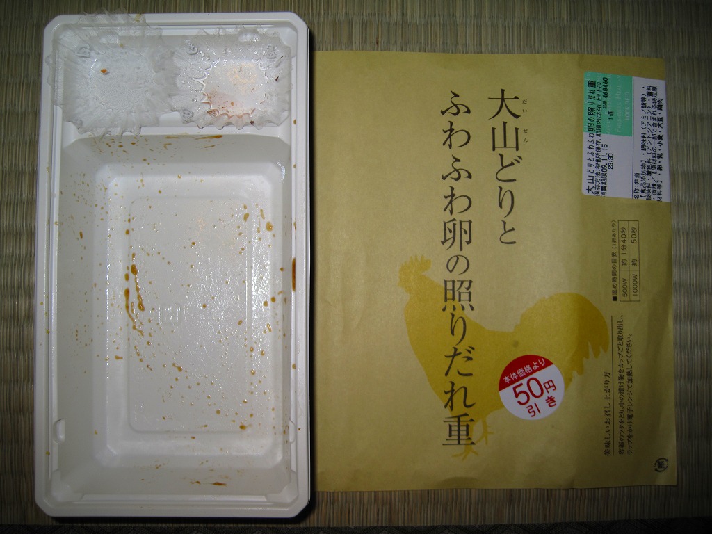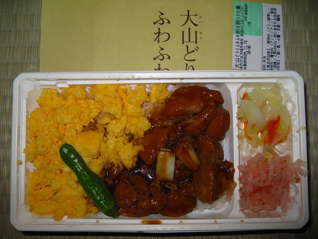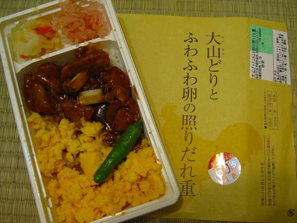 電子レンジ対応の白いプラ製トレーに透明なふたをして、商品名を書いた黄色くシンプルな掛紙を巻く。中身は白御飯の上に炒り卵と鶏肉ぶつ切りのタレ焼きを敷き詰めるもの。新宿の名物駅弁「鳥めし」をデパ地下風にアレンジしたような感じで、商品名どおりのふわふわした風味と食感を楽しめる。なお、購入価格は写真のとおり、50円引きシールで840円。
