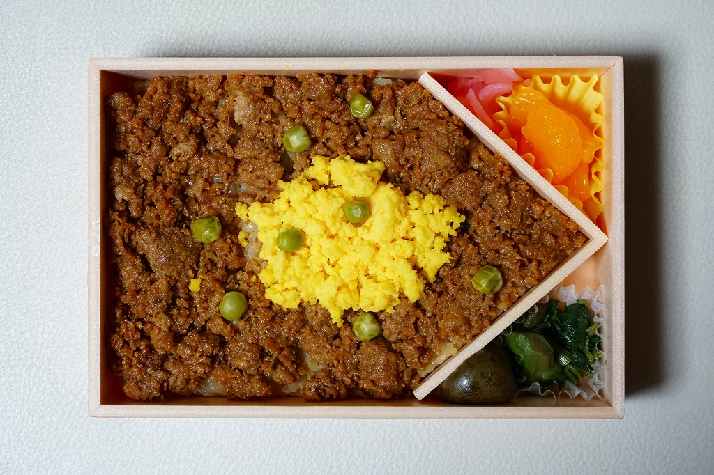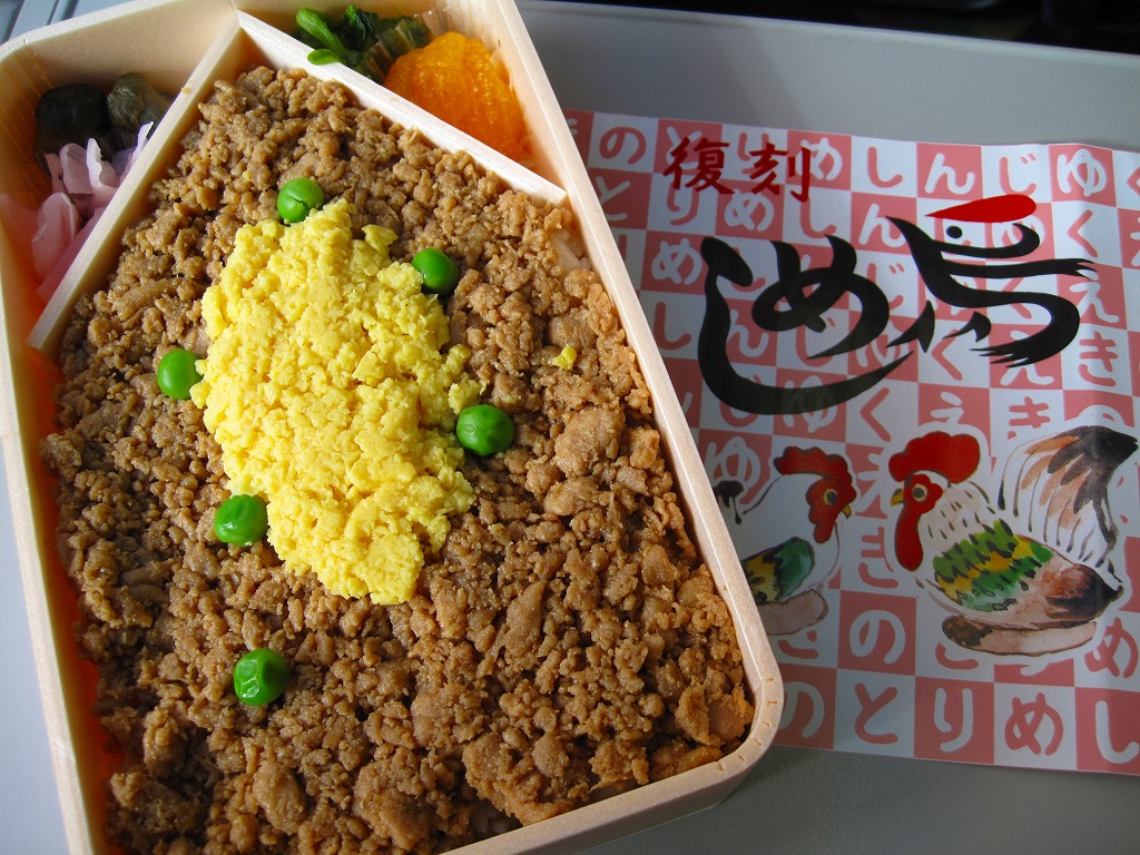 復刻版としては2001(平成23)年に発売。小柄な長方形の容器に透明なふたをして食品表示ラベルで留め、昭和の頃と同じ絵柄の掛紙を巻いてセロハンテープで留める。中身は味付け御飯の上にふわりとした鳥そぼろと玉子そぼろと、アクセントにグリーンピースを載せて、小ナス醤油漬、菜の花辛子和え、ダイコン桜漬け、ミカンを添えるもの。