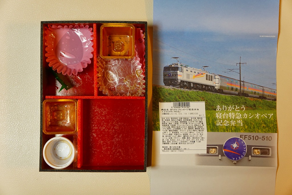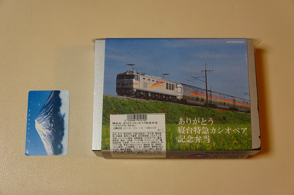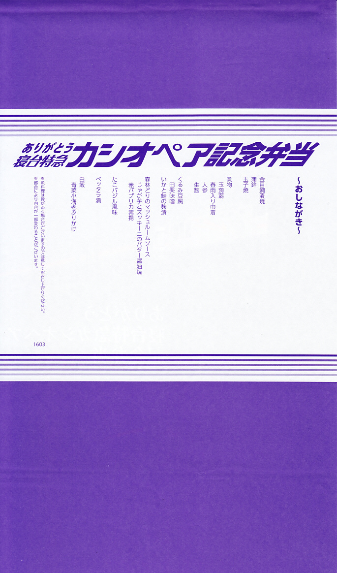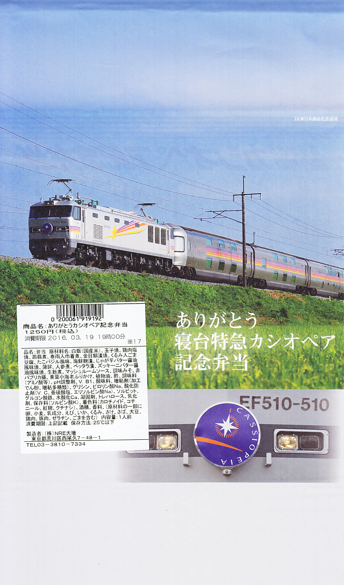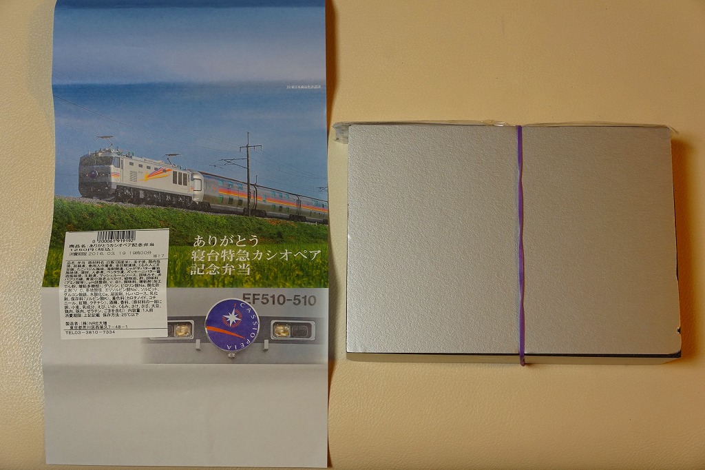 上野駅と札幌駅を結ぶ臨時寝台特急列車「カシオペア」の運転終了を記念して、2016(平成28)年3月1日から21日まで上野駅と鉄道博物館で販売。掛紙の写真はもちろん、寝台特急カシオペア号。販売期間前半の1日から12日までと、後半の13日から21日までで、異なる掛紙を使った。この写真は後半のもの。