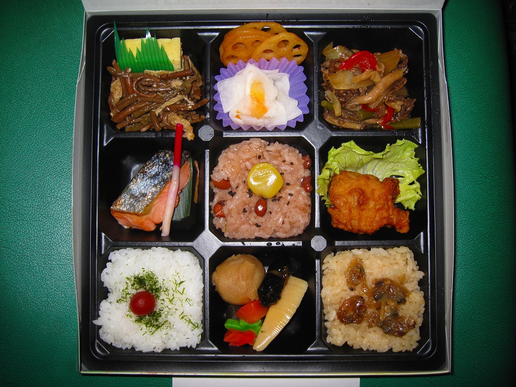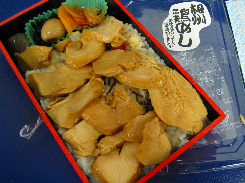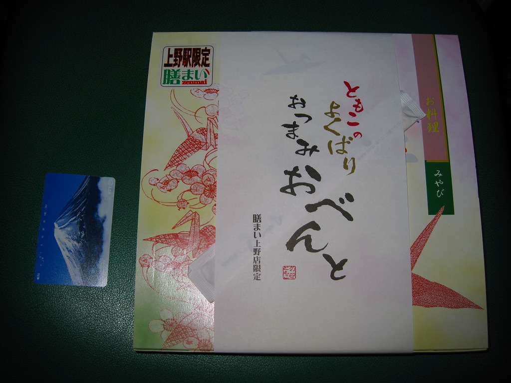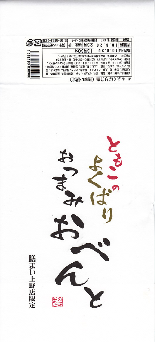 上野駅構内のスーパーマーケットで購入した弁当。黒塗りの長方形の容器に透明なふたをして、まるごとラップで包んでシールをいろいろ貼る。中身は白御飯の上に鶏肉ぶつ切りの照焼をたくさん貼り、うずらの煮玉子、こんにゃく、大根醤油漬を添えるもの。現存しない模様。