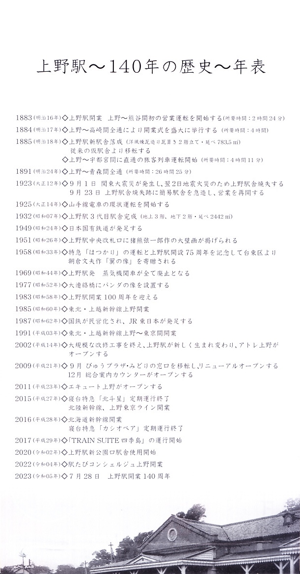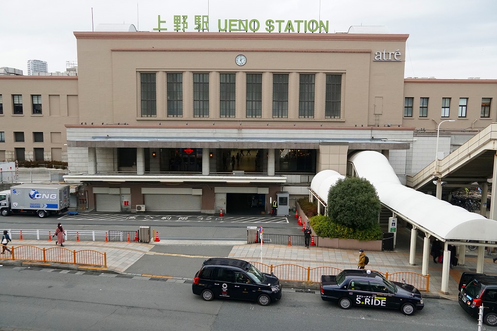東京の鉄道ターミナルのひとつ。1883(明治16)年の開業以来、東京の北の玄関口として、東北上信越地方や北海道連絡の長距離列車が100年以上ここを起終点とし、文学や歌にもよく表現された。1991(平成3)年の東北新幹線の東京駅への延伸や、2015(平成27)年の上野東京ラインの開業で、その役割を東京駅へ譲った。駅弁は東京駅と同じものが売られるが、昭和時代には日本食堂が支店を構えて別個に品を揃えた。1883(明治16)年7月28日開業、東京都台東区上野7丁目。