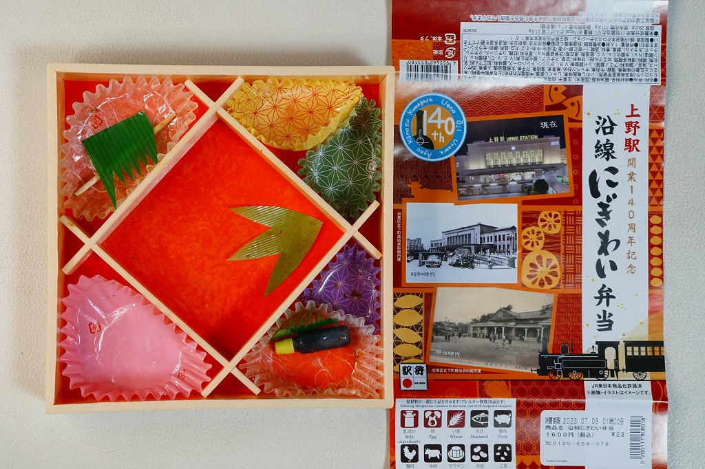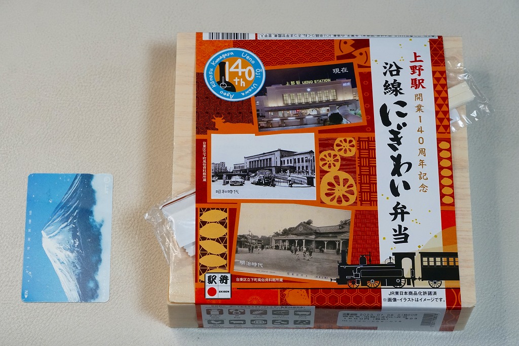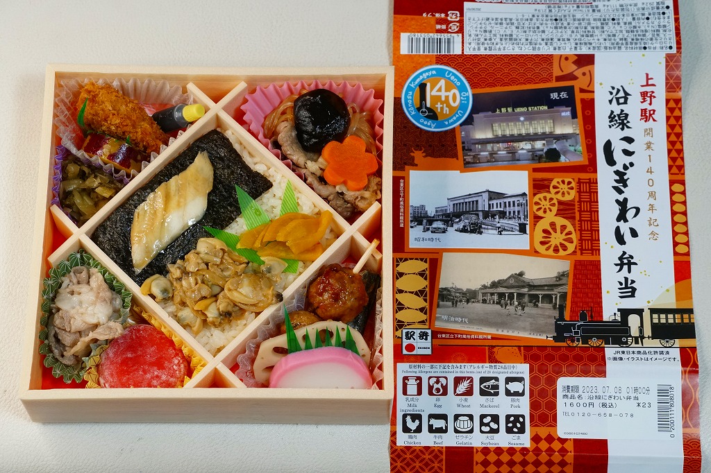 2023(令和5)年7月1日に上野駅と東京駅で発売。上野駅開業140周年を記念し、上野駅に乗り入れている山手線、京浜東北線、高崎線、宇都宮線、常磐線の沿線地域をイメージした食材を彩りよく盛り込んだ弁当なのだという。掛紙では明治時代と昭和時代と現在の上野駅舎の写真を使い、裏面に上野駅の年表を記す。