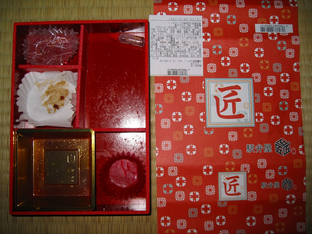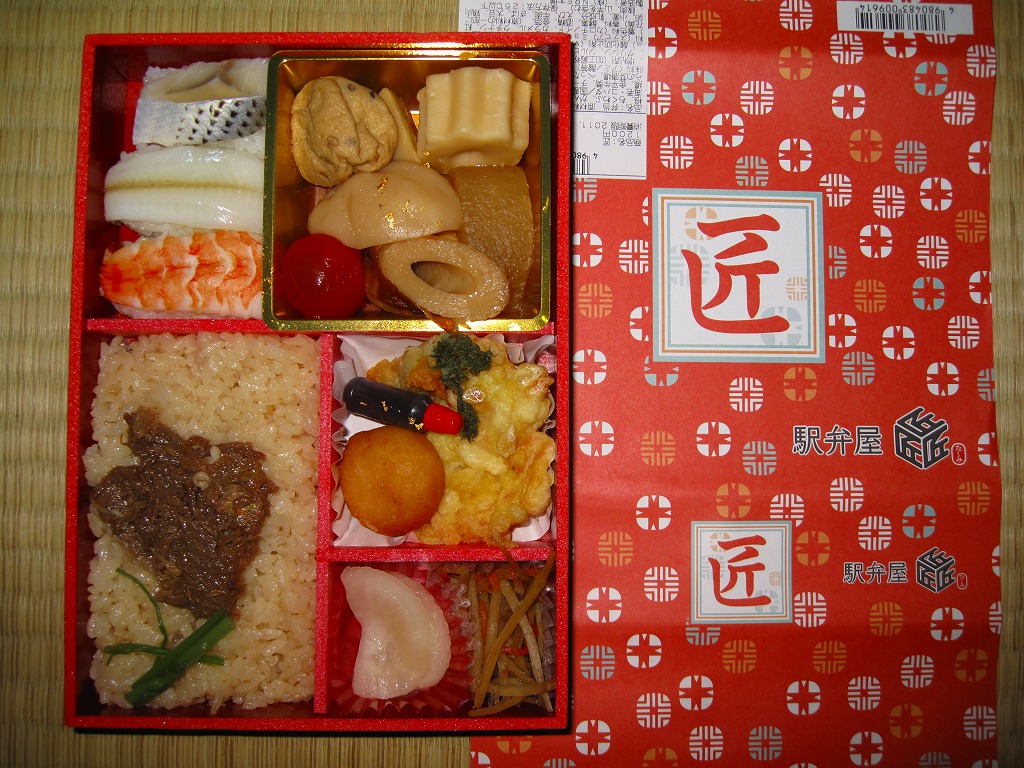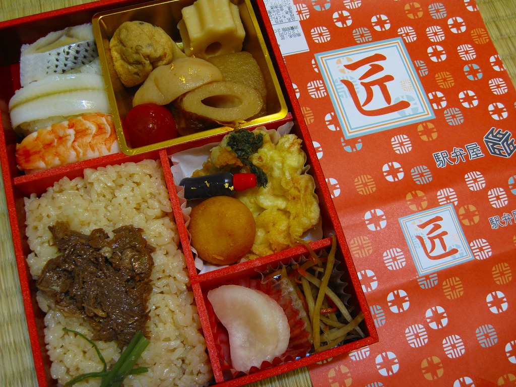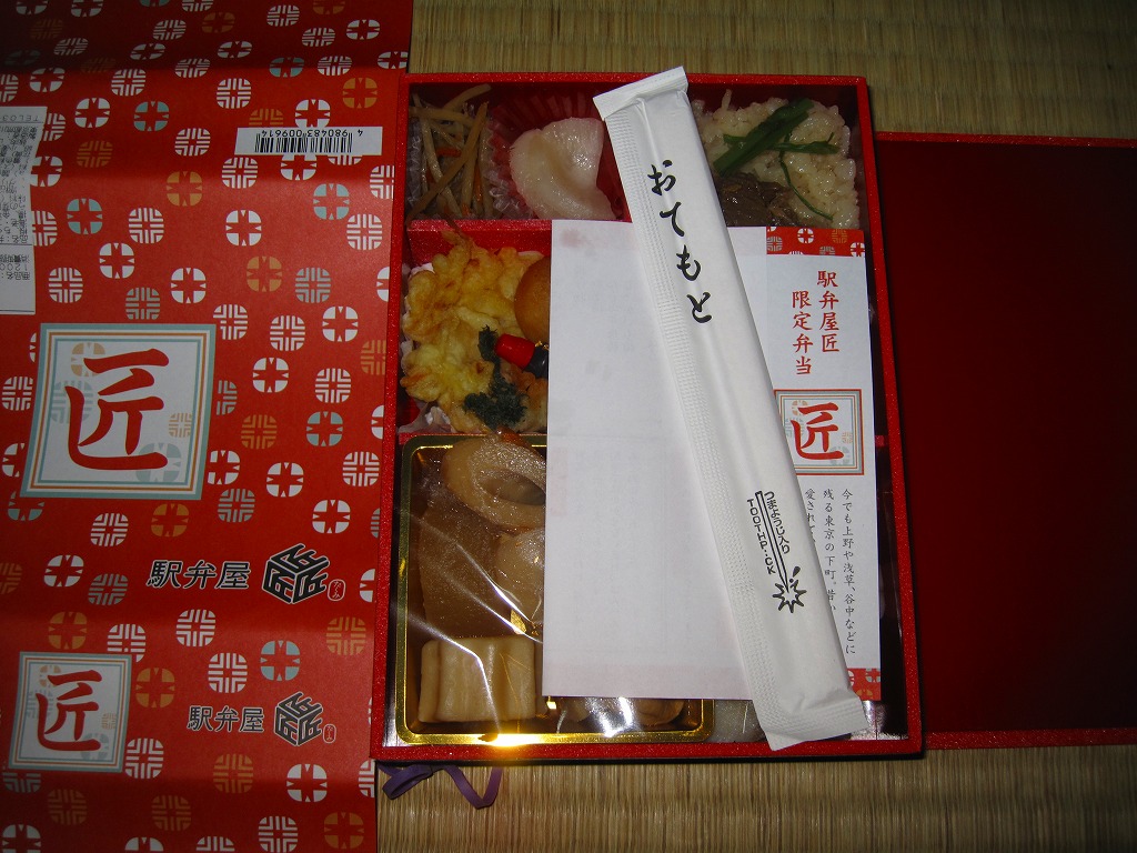 2011(平成23)年3月24日の上野駅商業施設「エキュート上野」内の駅弁売店「駅弁屋 匠」の開業に合わせて発売か。赤地に黒塗りな長方形の容器を、「匠」と記した朱色の掛紙で包む。中身は牛肉旨煮を載せた茶飯、コハダとキスとエビのにぎり寿司、かき揚げとタラの芽唐揚とジャガイモ揚、はんぺんやちくわぶなどのおでん、きんぽらごぼうとべったら漬。にぎり寿司は江戸前風、おでんは関東風ということで、それなりの個性はあると思う。現存しない模様。
