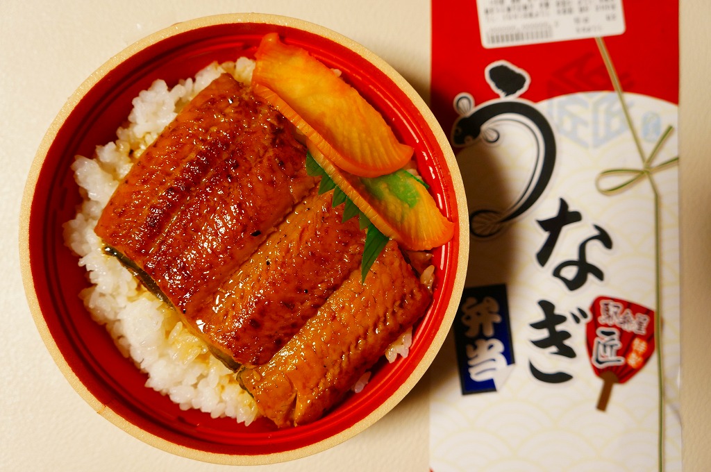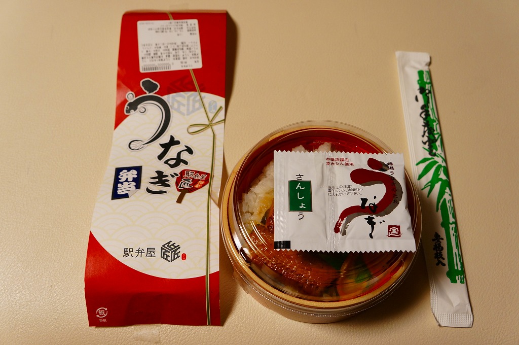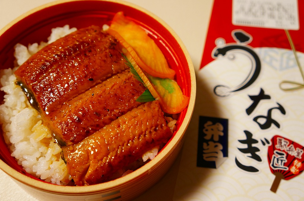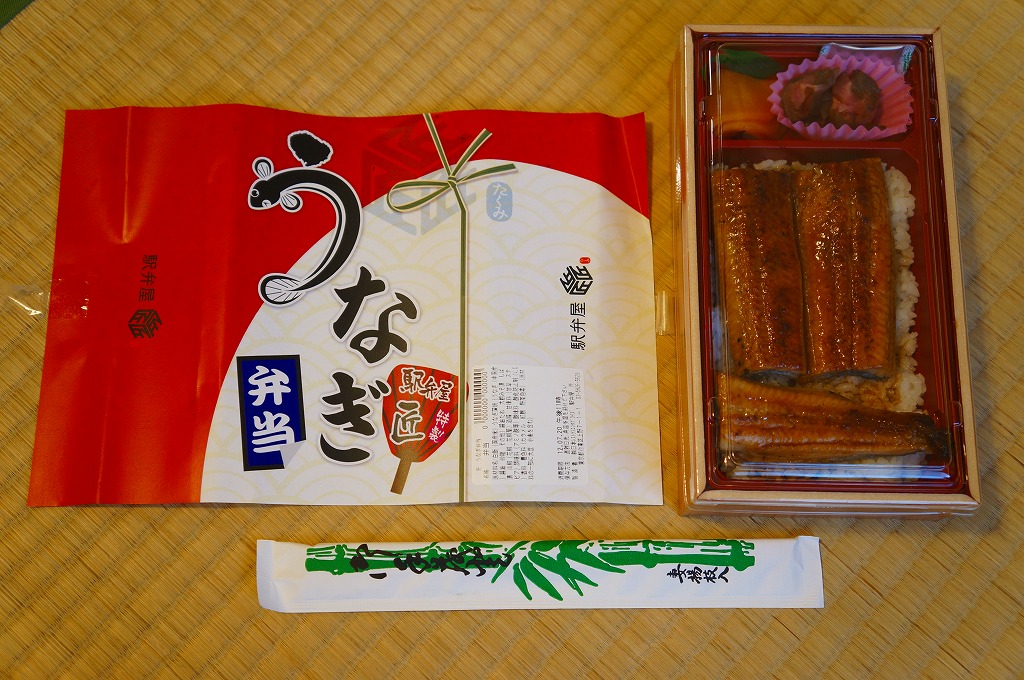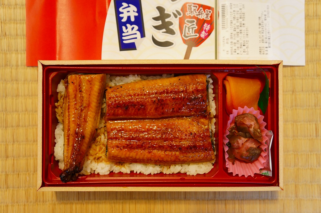 2012(平成24)年夏の期間限定駅弁で、掛紙を見ると上野駅の駅弁売店「駅弁屋 匠」でのみの販売か。多くの駅弁で使われる長方形の容器を使用、中身は白御飯の上をウナギの蒲焼きで覆い、ダイコンの味噌煮と柴漬けを添えるシンプルなもの。浜松駅弁が二千円を超えるようなこの夏のウナギの高騰を考えると、なぜ例年通りの普段着な姿で出て来られたのか不思議である。