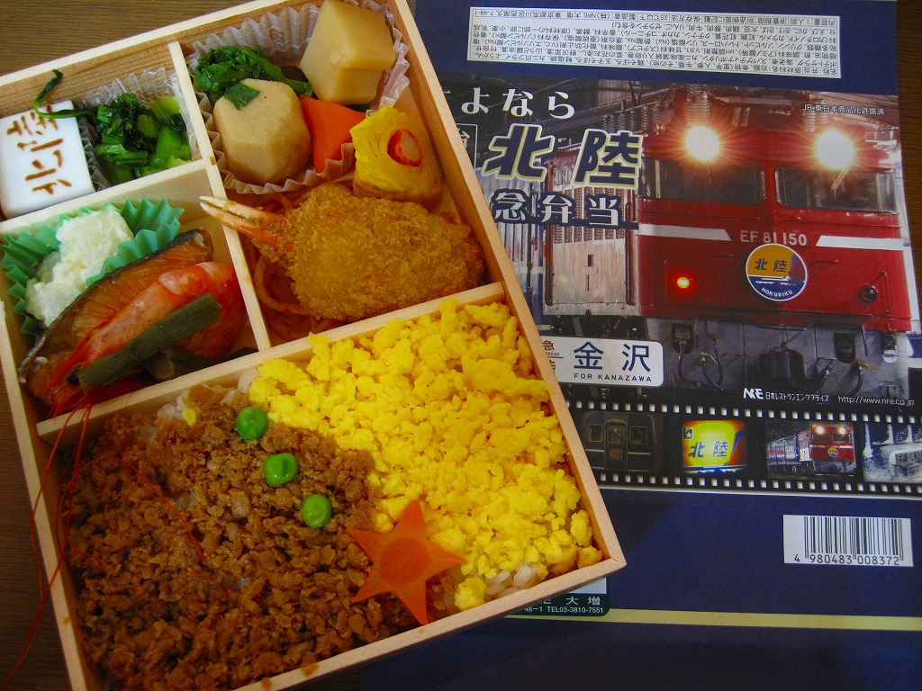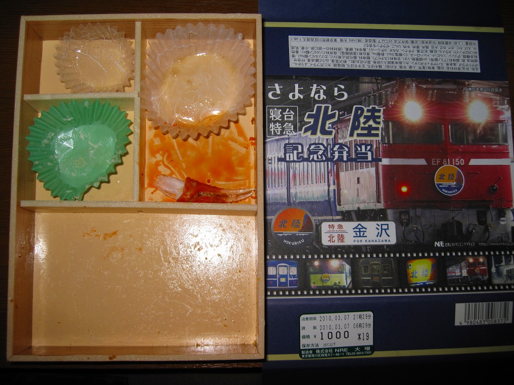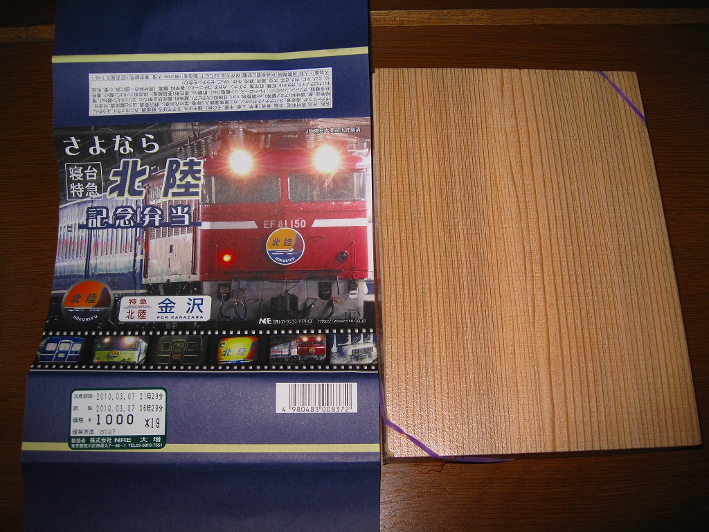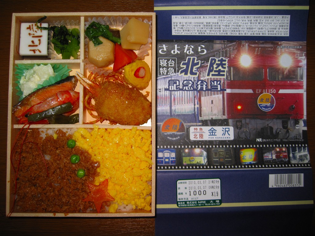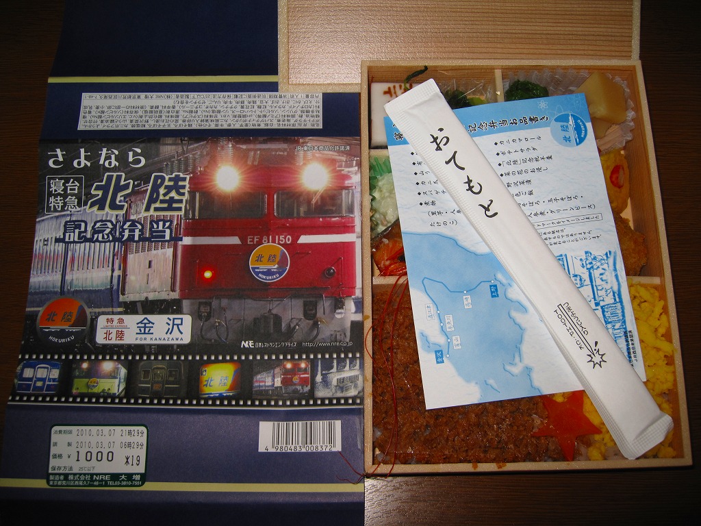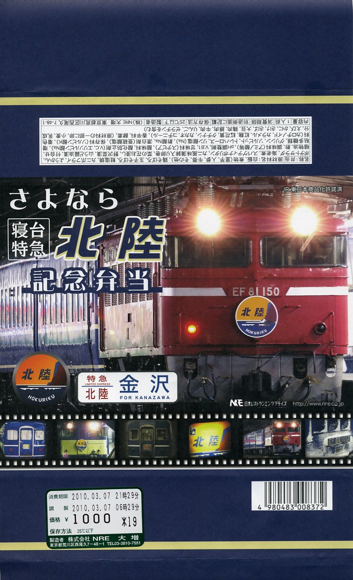 上野と金沢を結ぶ寝台特急列車「北陸」の廃止を記念して、2010(平成22)年3月1日から13日まで販売された記念駅弁。木目柄で長方形の容器を輪ゴムで留め、寝台特急列車の写真をいくつも並べた掛紙を巻き、セロハンテープで留める。掛紙のデザインは3月1日から4日まで、5日から8日まで、9日から13日までの各日で異なるデザインとしたそうな。