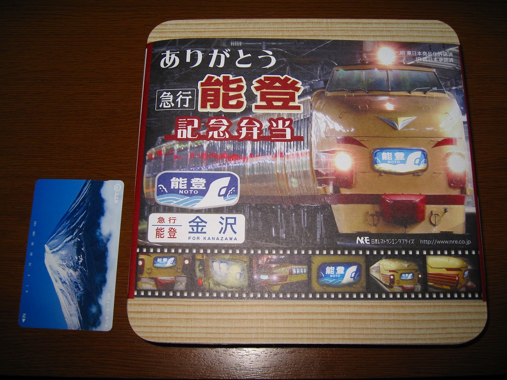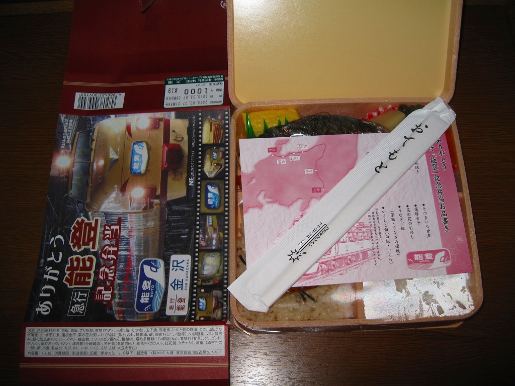 上野と金沢を結ぶ急行列車「能登」の廃止を記念して、2010(平成22)年3月1日から13日まで販売された記念駅弁。正方形の容器に木目柄のボール紙でふたをして、急行列車の写真をいくつも並べた掛紙を巻き、セロハンテープで留める。中身はイクラ付き白御飯とウナギ付き茶飯、ブリ照焼、有頭海老、カニ爪焼き、玉子焼、イカとサケの和え物、ホタテやタケノコなどの煮物など。