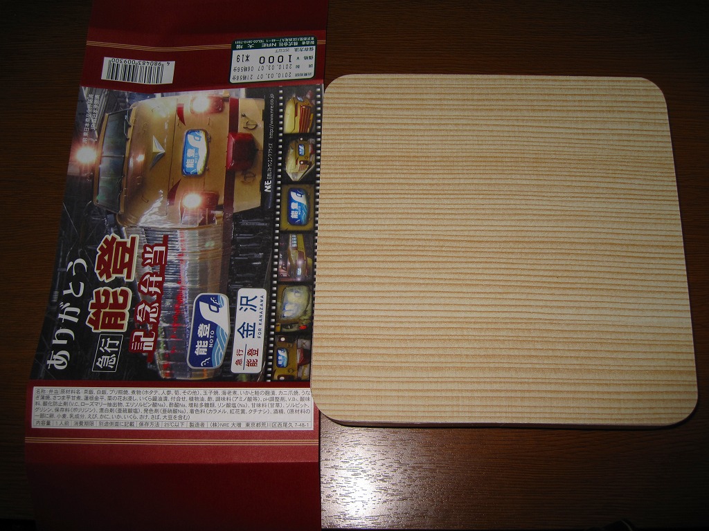 列車の運行経路にちなんだ内容は、大きな大きな焼ブリにこそ感心したものの、それを除けば千円を取るのが恥ずかしい並等幕の内。掛紙目的で買われる弁当だろうから、これでよし。掛紙のデザインはいい感じに決まっているし、しかも3月1日から4日まで、5日から8日まで、9日から13日までの各日で異なるデザインとしたそうな。