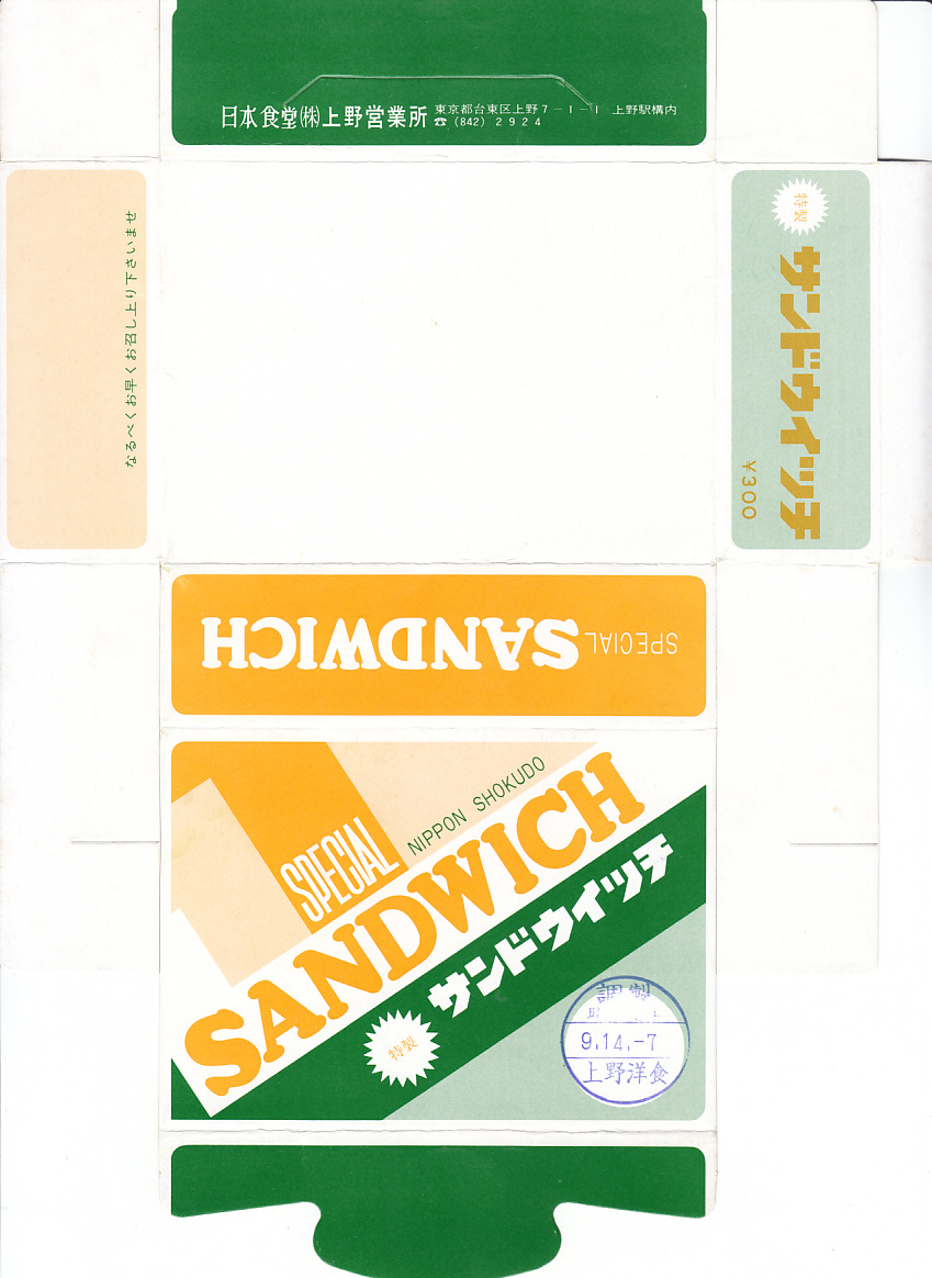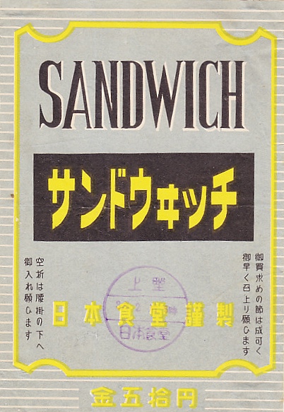 1953(昭和28)年3月2日の調製と思われる、昔の上野駅弁の掛紙。調製印に上野とあるのでそう考えた。昭和時代の日本食堂は日本中で列車内営業を手掛けたため、この掛紙も全国共通、あるいは上野の営業所が持つ列車の車内調製品とも考えられる。どんな内容のサンドイッチだったのだろう。