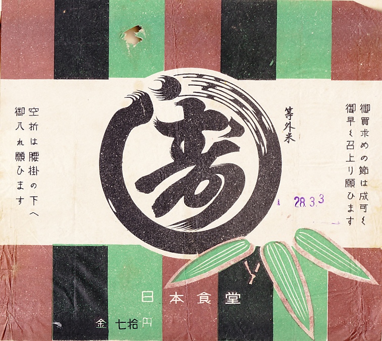 1953(昭和28)年3月3日の調製と思われる、昔の上野駅弁の掛紙。掛紙に駅名や所在地の記載がないが、収集者はこれを上野駅の駅弁とみなしていた。「等外米」の印字に時代を感じる。1952(昭和27)年から1956(昭和31)年頃まで、政府配給の外食券が不要な等外米の駅弁が、各地で販売された。